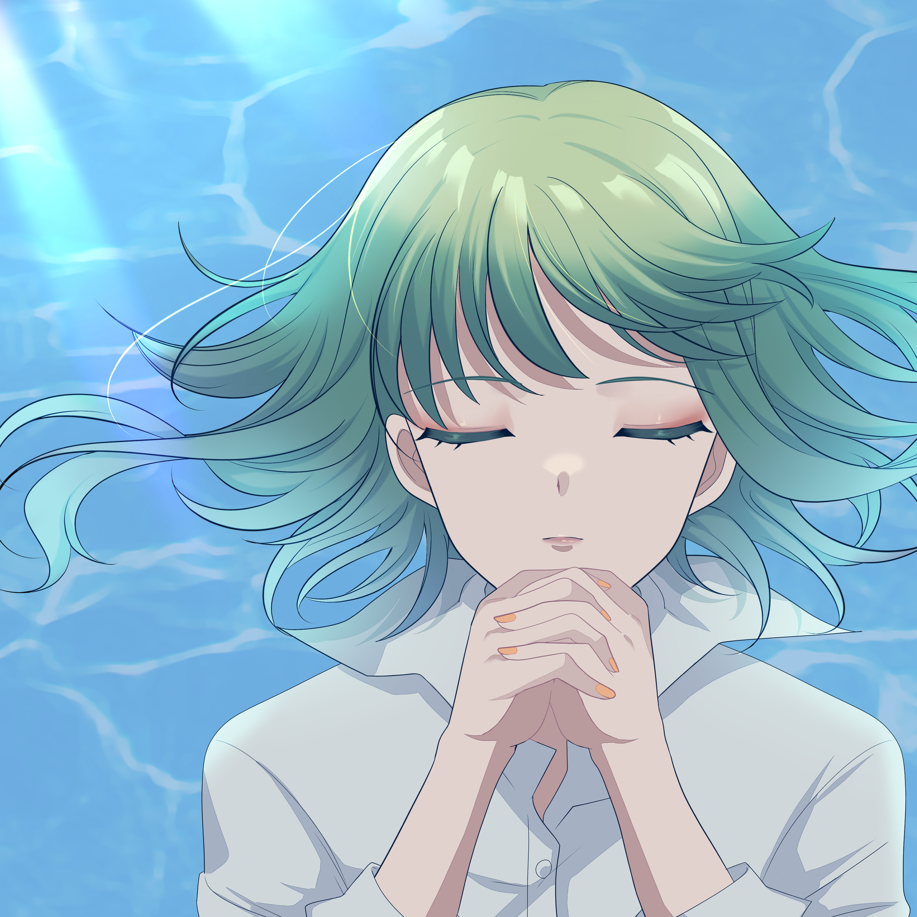 1girl absurdres closed_eyes collared_shirt commission expressionless green_hair gumi highres kamikawa_celery long_hair own_hands_clasped own_hands_together pixiv_commission popped_collar shirt solo upper_body vocaloid water