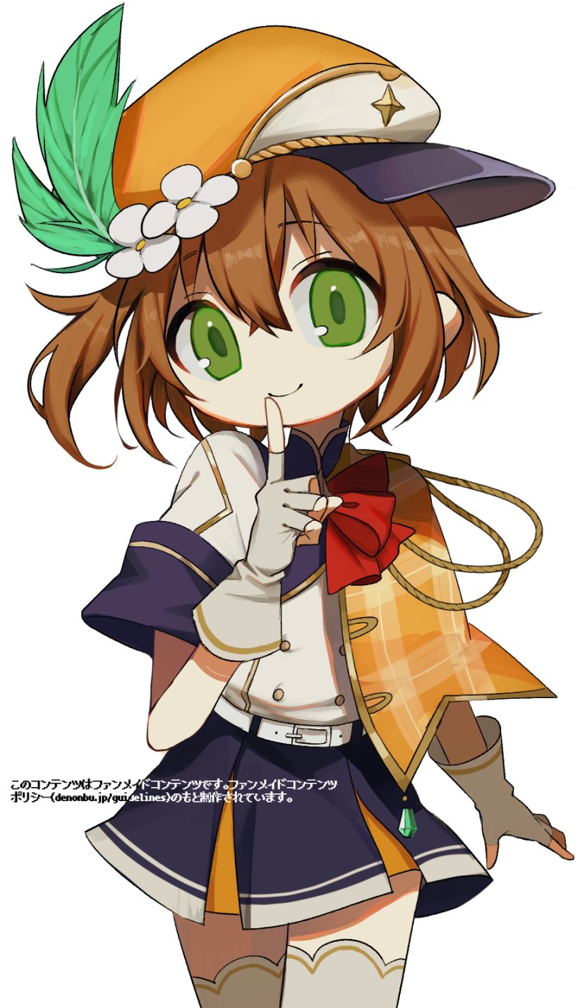 aiguillette belt blue_skirt brown_hair closed_mouth commentary_request cowboy_shot denonbu finger_to_mouth fingerless_gloves flower gloves green_eyes hair_between_eyes hand_up hat hat_feather hat_flower hidaka_reina_(denonbu) highres idol_clothes index_finger_raised jacket looking_at_viewer official_alternate_costume orange_hat pleated_skirt sai_(psy_0) short_hair short_sleeves shushing side_cape skirt smile standing thighhighs translated white_belt white_flower white_gloves white_jacket white_thighhighs