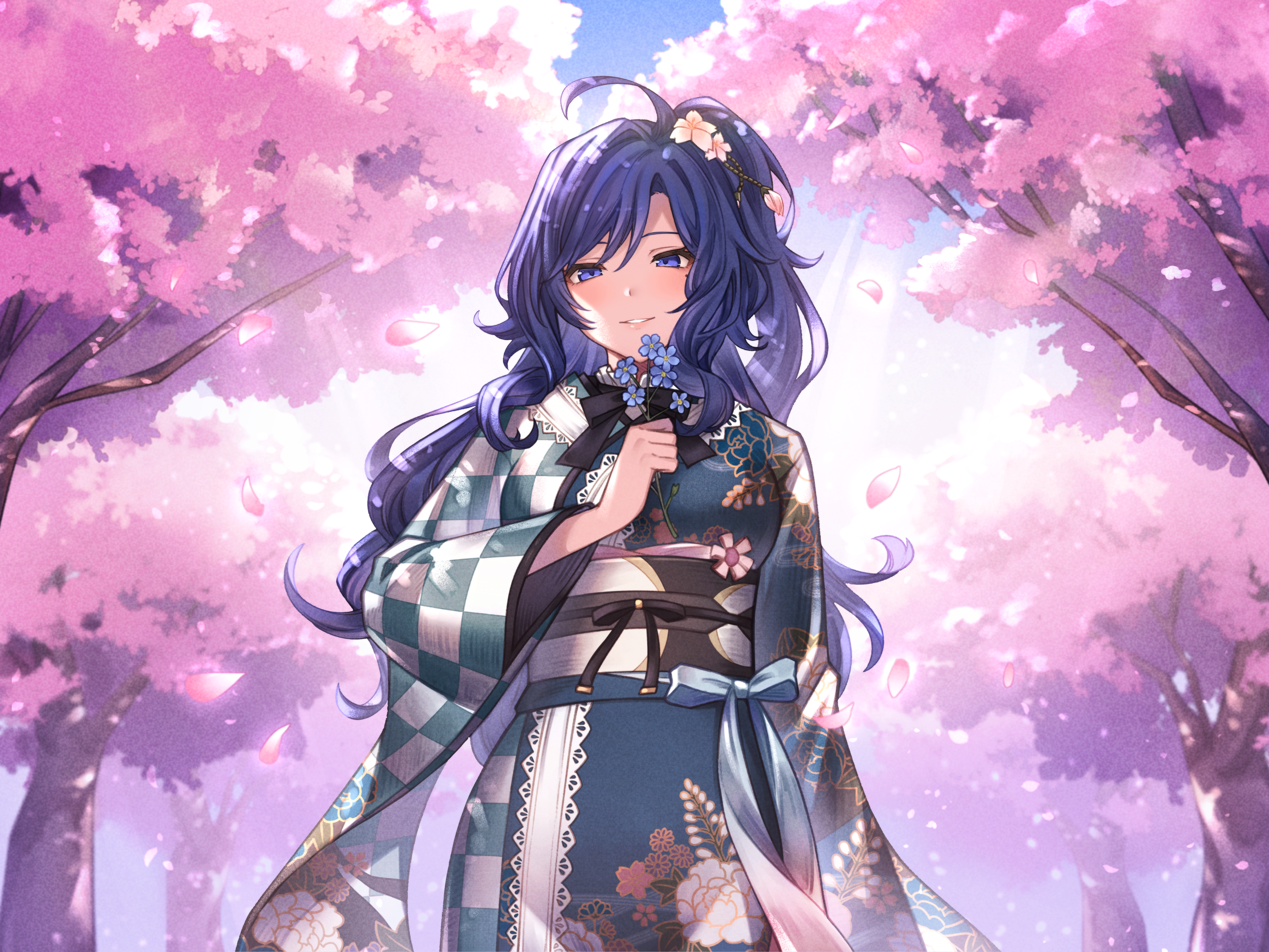 1girl absurdres ahoge annno_ans black_ribbon blue_eyes blue_flower blue_hair blue_sky checkered_clothes checkered_kimono cherry_blossoms cherry_tree dark_blue_hair falling_petals floral_print flower grin hair_flower hair_ornament hand_up highres holding holding_flower japanese_clothes kimono long_hair looking_at_viewer neck_ribbon obi one_side_up outdoors petals pink_flower print_kimono ribbon sash sawami_yuzu sky smile solo toki_production upper_body virtual_youtuber wide_sleeves