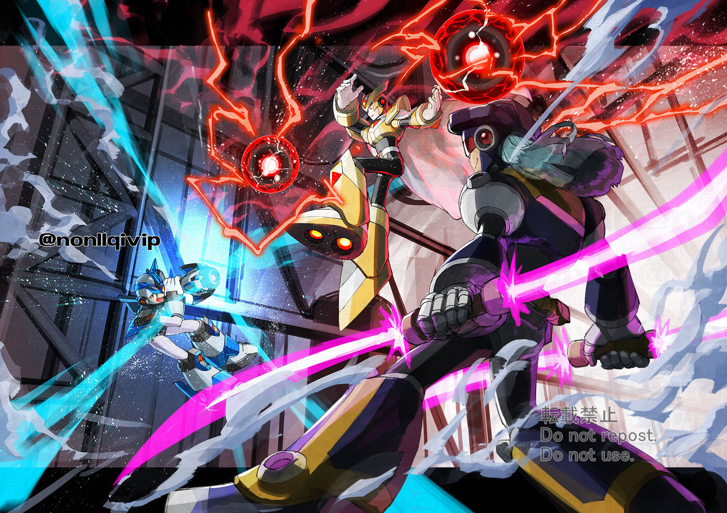 3boys arm_cannon armor battle black_armor black_helmet cape chest_jewel double_blade double_bladed_lightsaber energy energy_sword forehead_jewel gate_(mega_man) gold_armor gold_helmet helmet holding holding_sword holding_weapon lightsaber long_hair male_focus mega_man_(series) mega_man_x_(series) multiple_boys official_alternate_color sword twitter_username ultimate_armor_x_(mega_man) weapon white_armor white_cape white_hair white_helmet x_(mega_man) arm_cannon yamanashi_taiki