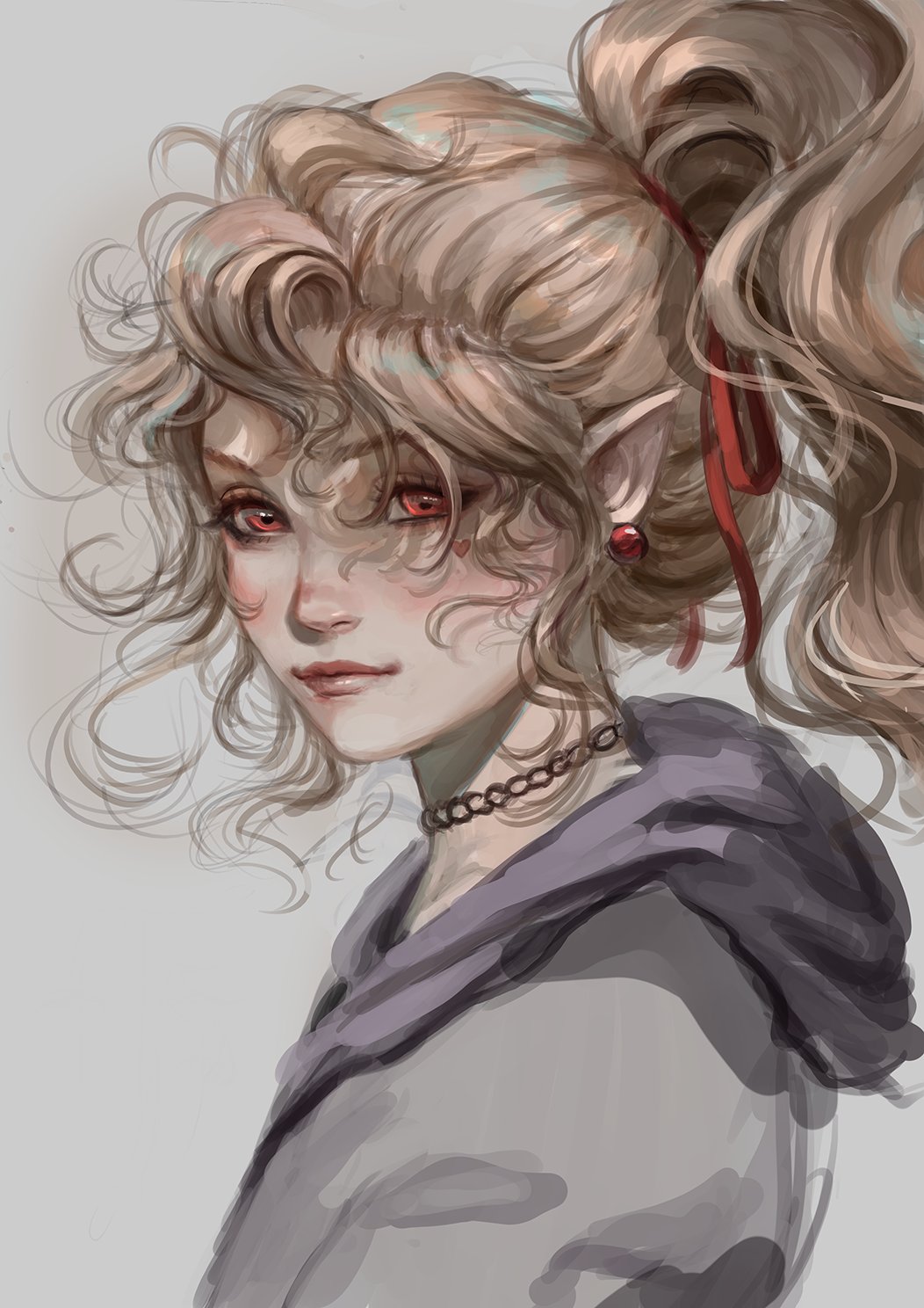1girl blonde_hair choker earrings hair_ribbon highres hood hoodie jewelry original pointy_ears ponytail red_eyes ribbon solo tagme vampire wavy_hair whails