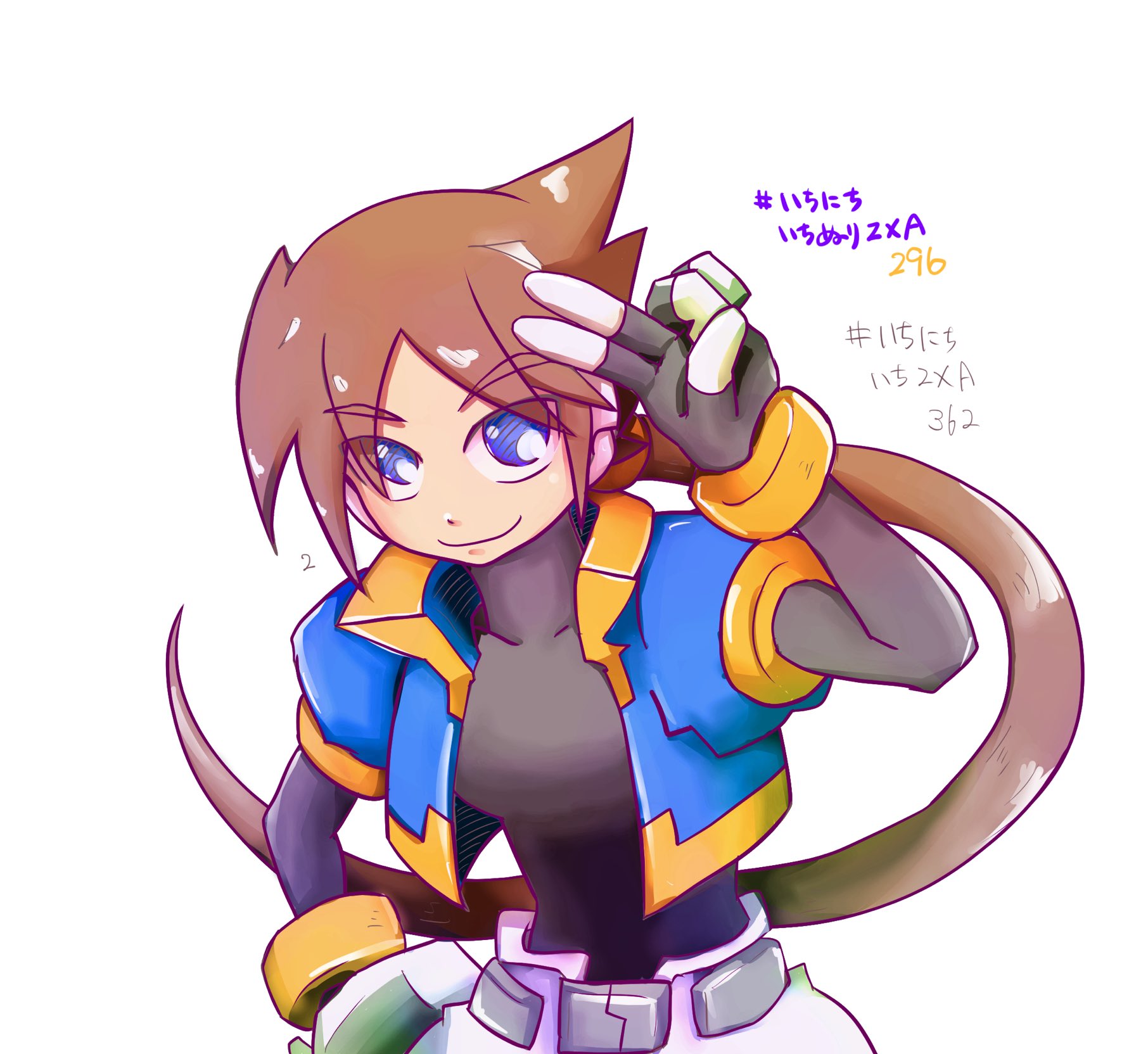 1girl aile_(mega_man_zx) black_bodysuit blue_eyes blue_jacket bodysuit brown_hair commentary_request cropped_jacket highres jacket long_hair looking_at_viewer mega_man_(series) mega_man_zx mega_man_zx_advent ponytail ryokuchadattayo salute shorts simple_background smile solo two-finger_salute upper_body white_background white_shorts