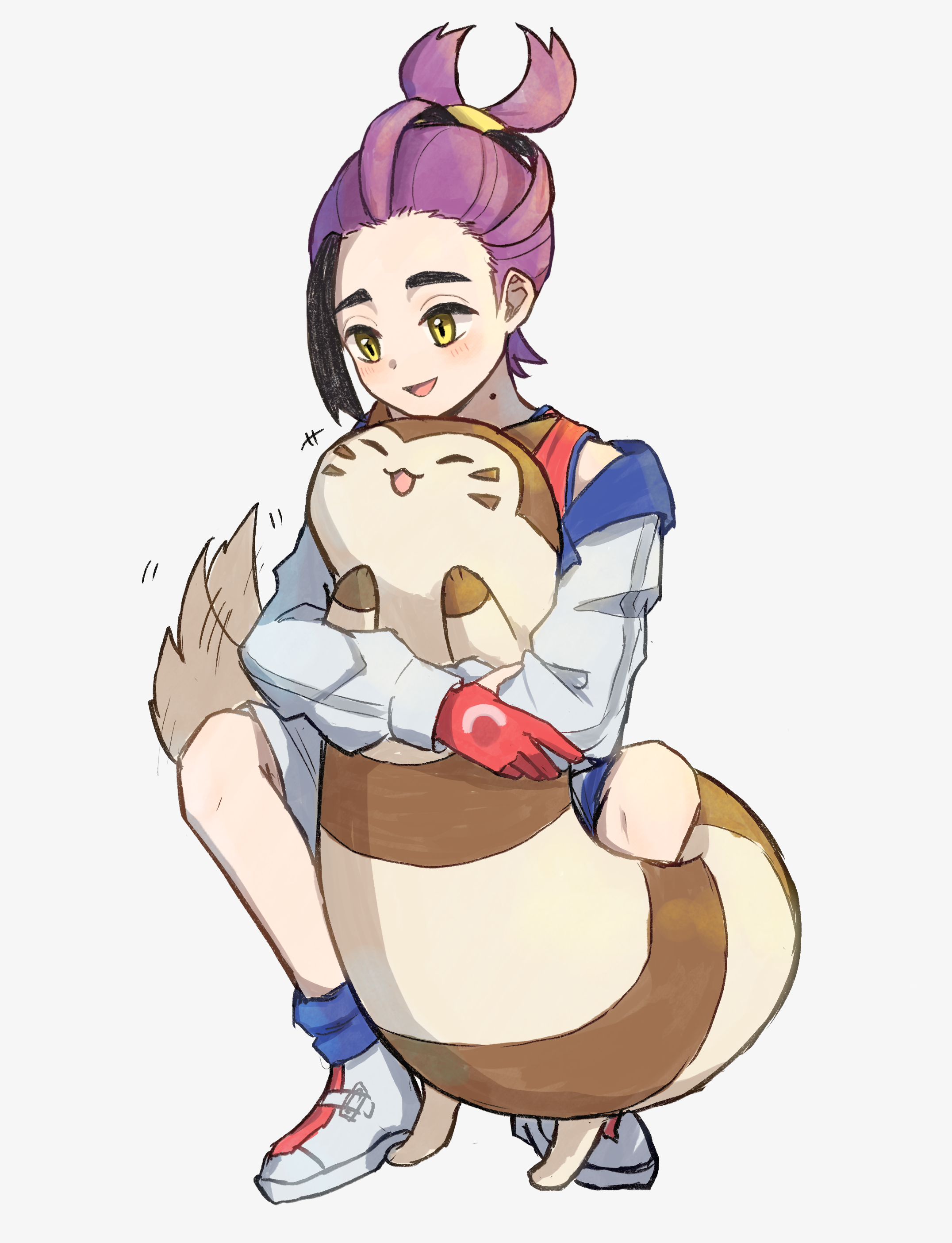 +++ 1boy absurdres black_hair blush commentary_request ebi-chan_(tvyd2583) furret gen_2_pokemon gloves highres jacket kieran_(pokemon) male_focus multicolored_hair nintendo open_mouth partially_fingerless_gloves pokemon pokemon_(creature) pokemon_scarlet_and_violet purple_hair shirt shoes shorts smile socks squatting tail tail_wagging tank_top two-tone_hair white_background yellow_eyes