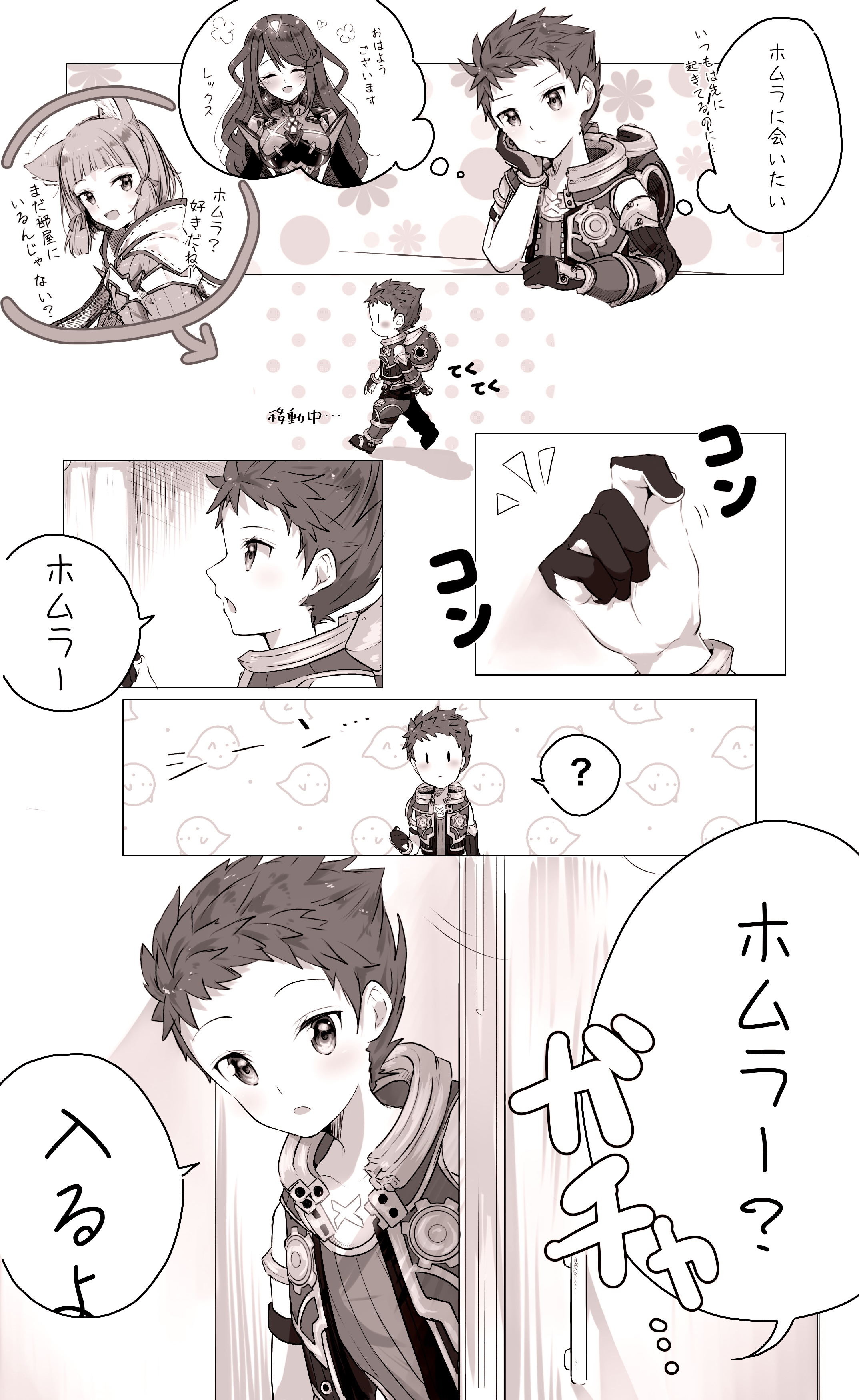 absurdres alternate_hair_length alternate_hairstyle comic highres japanese_text monochrome nemu_(ut_kakinotane) nia_(xenoblade) pyra_(xenoblade) rex_(xenoblade) xenoblade_chronicles_(series) xenoblade_chronicles_2