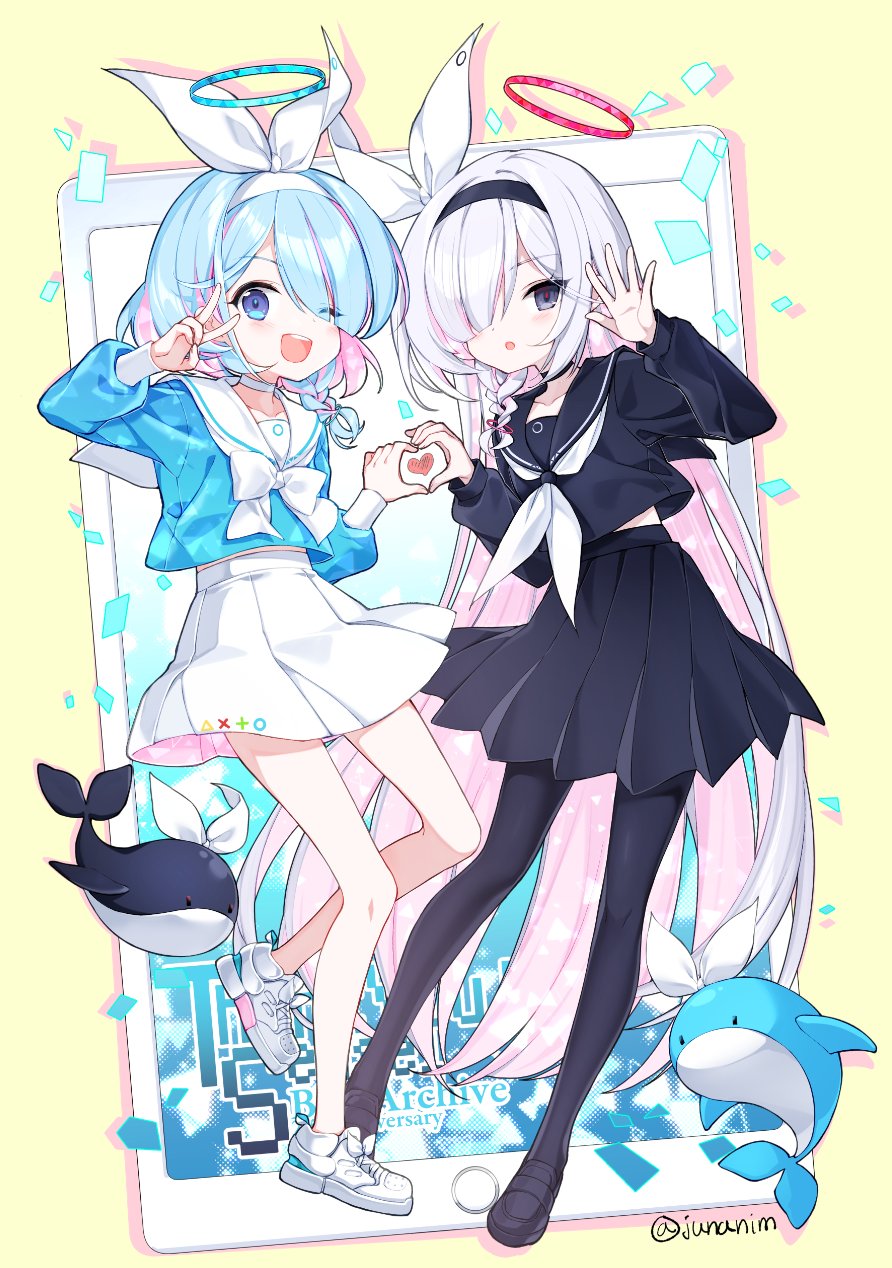 2girls arona_(blue_archive) black_choker black_eyes black_footwear black_pantyhose black_sailor_collar black_serafuku black_skirt blue_archive blue_eyes blue_hair blue_halo blush braid choker colored_inner_hair flower full_body hair_over_one_eye halo heart heart_hands heart_hands_duo highres juna long_hair long_sleeves looking_at_viewer multicolored_hair multiple_girls neckerchief one_eye_closed open_mouth pantyhose pink_hair plana_(blue_archive) pleated_skirt red_halo sailor_collar school_uniform serafuku shoes short_hair single_braid skirt smile white_choker white_flower white_hair white_neckerchief white_sailor_collar white_skirt
