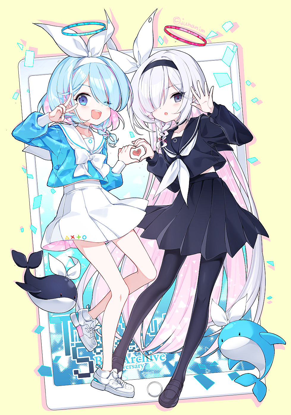 2girls arona_(blue_archive) black_choker black_eyes black_footwear black_pantyhose black_sailor_collar black_serafuku black_skirt blue_archive blue_eyes blue_hair blue_halo blush braid choker colored_inner_hair flower full_body hair_over_one_eye halo heart heart_hands heart_hands_duo highres juna long_hair long_sleeves looking_at_viewer multicolored_hair multiple_girls neckerchief one_eye_closed open_mouth pantyhose pink_hair plana_(blue_archive) pleated_skirt red_halo sailor_collar school_uniform serafuku shoes short_hair single_braid skirt smile white_choker white_flower white_hair white_neckerchief white_sailor_collar white_skirt