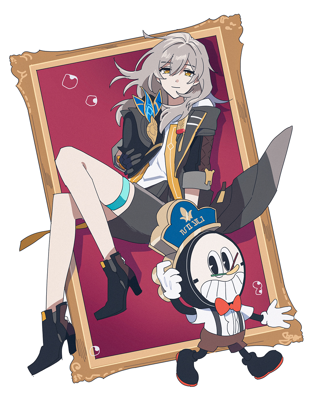 1boy 1girl air_bubble ankle_boots black_eyes black_footwear black_gloves black_hat black_jacket black_shorts boots bow bowtie brown_hair brown_shorts bubble clock clockie_(honkai:_star_rail) from_side full_body gloves grin hat high_heel_boots high_heels highres holding holding_unworn_clothes holding_unworn_hat honkai:_star_rail honkai_(series) invisible_chair jacket looking_at_viewer medium_hair open_clothes open_jacket picture_frame red_bow red_bowtie shirt shorts sitting smile stelle_(honkai:_star_rail) suspender_shorts suspenders thigh_strap trailblazer_(honkai:_star_rail) udeudede unworn_hat unworn_headwear white_background white_gloves white_shirt yellow_eyes