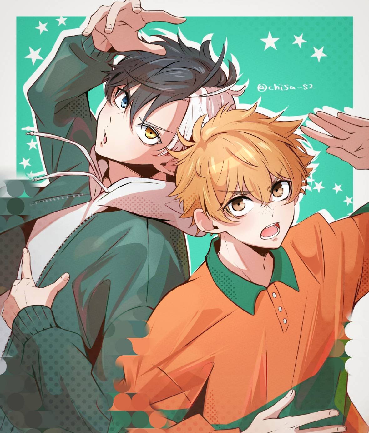 2boys :o black_hair blonde_hair chifu_s2 collared_shirt green_jacket heterochromia highres hood hooded_jacket jacket long_sleeves multicolored_hair multiple_boys nirei_akihiko open_mouth orange_shirt sakura_haruka_(wind_breaker) shirt short_hair split-color_hair v-shaped_eyebrows white_hair wind_breaker_(nii_satoru) yellow_eyes
