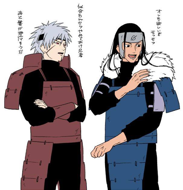 armor black_shirt blue_armor brothers cosplay costume_switch crossed_arms dark-skinned_male brown_hair dark_skin facial_mark family fluffy_collar forehead_protector grey_hair happy japanese_text long_hair long_sleeves naruto_(series) naruto_shippuuden red_armor red_eyes scar scar_on_face senju_hashirama senju_tobirama shirt siblings translated