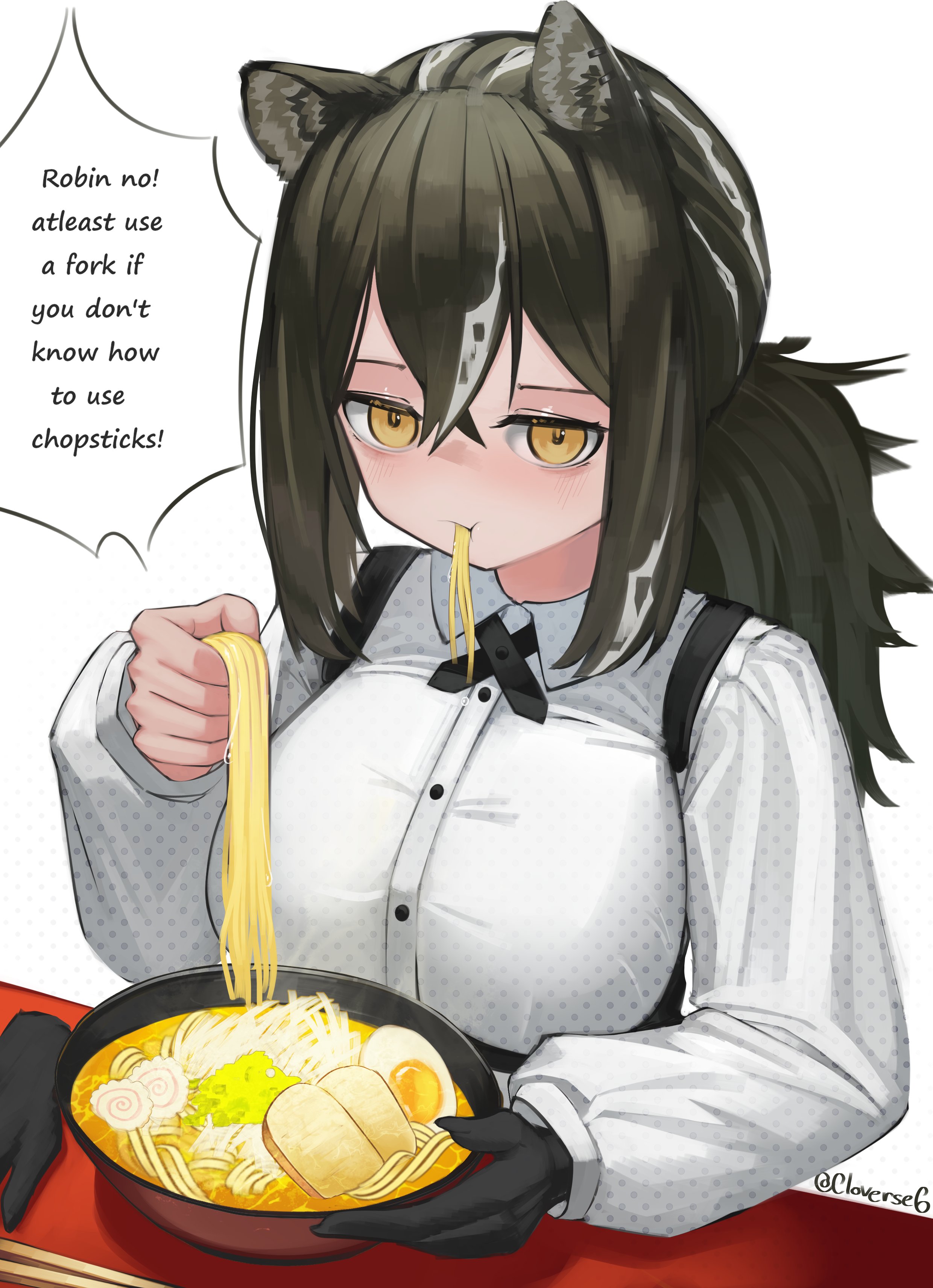 1girl absurdres ai-generated_art_(topic) ai_drawing_anime_characters_eating_ramen_(meme) animal_ears arknights breasts brown_hair chopsticks cloverse6 collared_shirt commentary cross_tie eating english_commentary english_text food gloves hair_between_eyes highres holding large_breasts long_sleeves looking_at_viewer noodles ponytail raccoon_ears raccoon_girl ramen robin_(arknights) shirt simple_background single_glove solo twitter_username unworn_gloves white_background white_shirt yellow_eyes