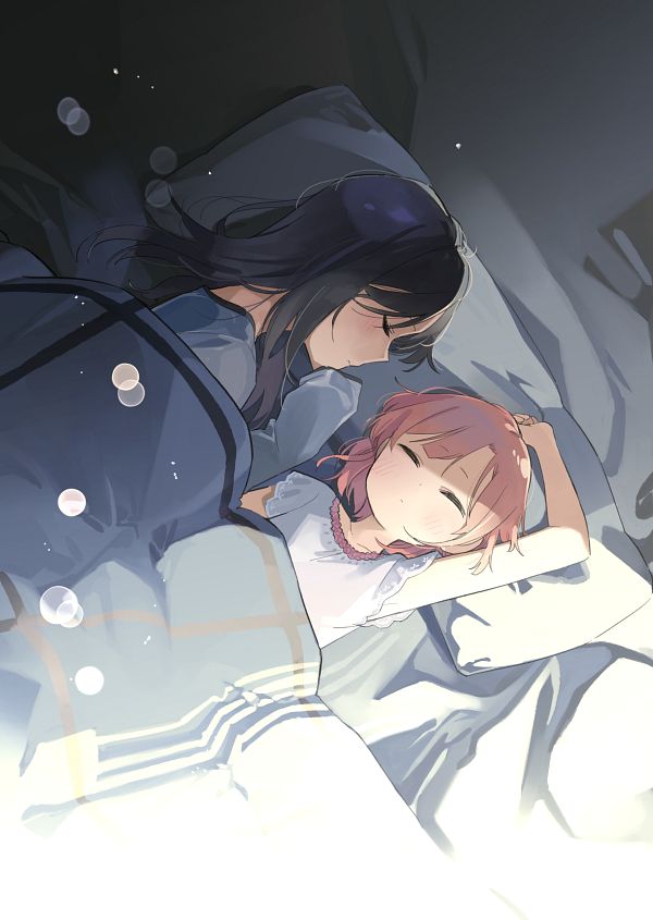 2girls black_hair closed_eyes giji_harem grey_shirt long_hair lying multiple_girls nanakura_ayaka nanakura_rin official_art pink_hair shirt sleeping very_long_hair white_shirt