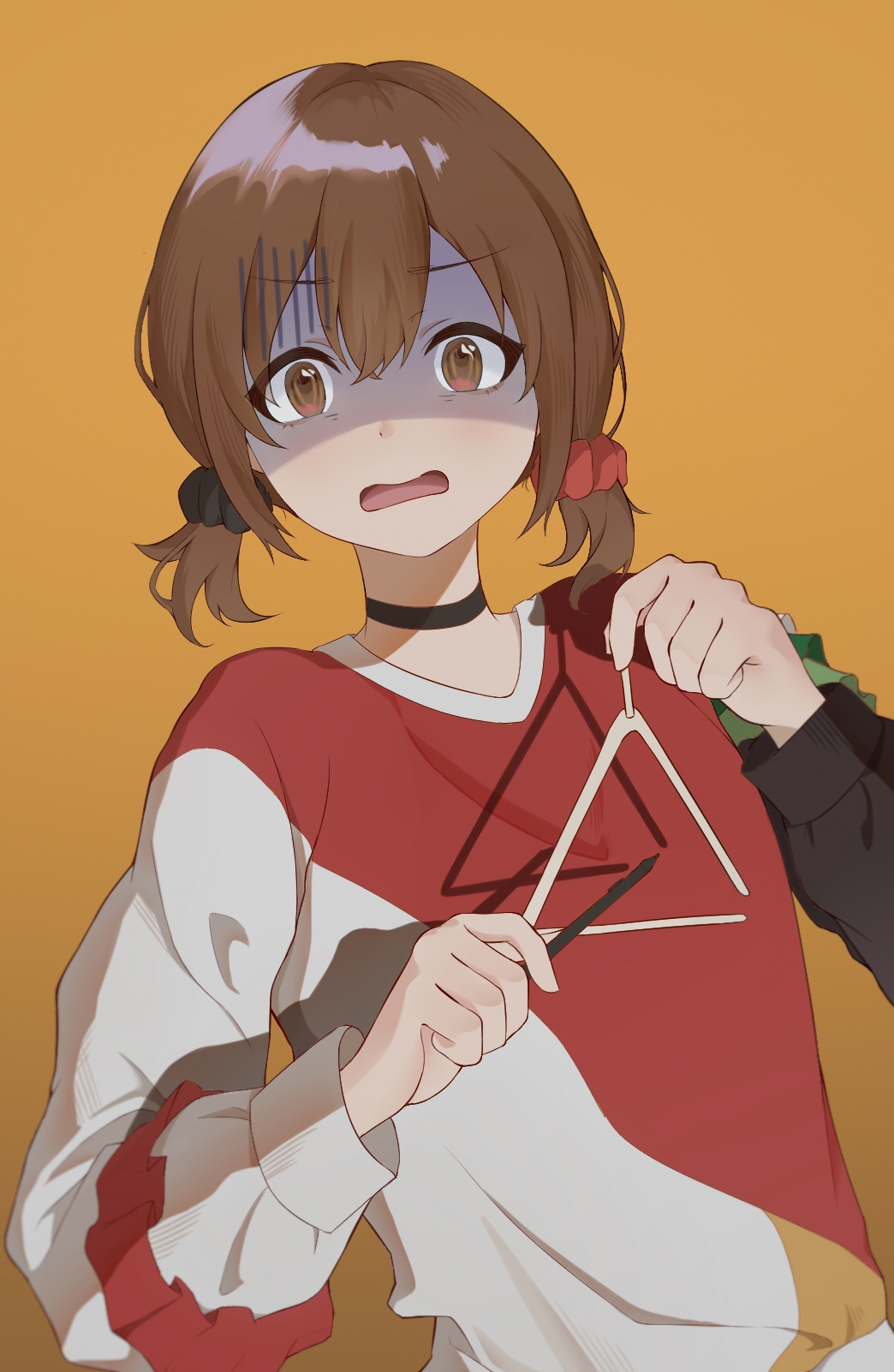 1girl black_choker black_scrunchie brown_background brown_eyes brown_hair brown_haori chinese_commentary choker commentary_request gloom_(expression) hair_ornament hair_scrunchie haori highres instrument kouzuki_mahiru lanyueqi long_sleeves low_twintails open_mouth red_scrunchie red_shirt scrunchie shirt short_twintails solo triangle_(instrument) twintails two-tone_shirt variant_set white_shirt yoru_no_kurage_wa_oyogenai