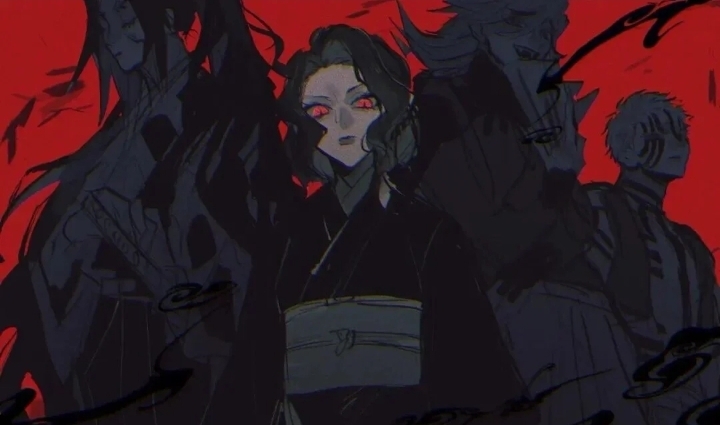 1girl 3boys aaaqi91749 akaza_(kimetsu_no_yaiba) black_hair demon_boy douma_(kimetsu_no_yaiba) genderswap genderswap_(mtf) japanese_clothes kibutsuji_muzan kibutsuji_muzan_(female) kimetsu_no_yaiba kimono kokushibou long_hair looking_at_viewer multiple_boys red_background