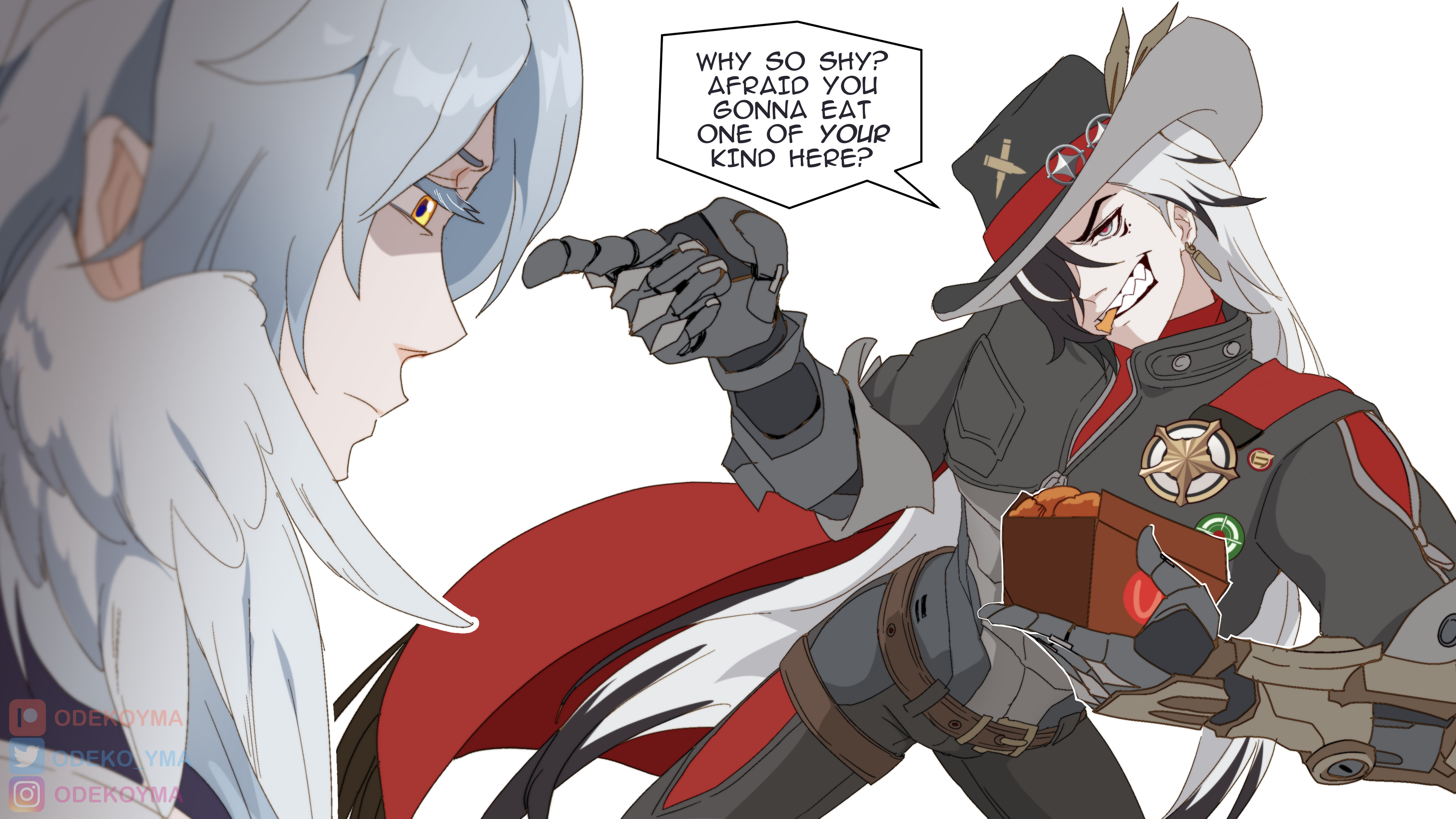 2boys absurdres belt black_hair black_hat black_jacket black_pants boothill_(honkai:_star_rail) box brown_belt chicken_(food) colored_eyelashes commentary earrings english_text fedora food fried_chicken grey_hair hat head_tilt head_wings highres holding holding_box honkai:_star_rail honkai_(series) jacket jewelry male_focus mouth_hold multicolored_hair multiple_boys odeko_yma pants pointing pointing_at_another sharp_teeth short_sleeves simple_background speech_bubble streaked_hair sunday_(honkai:_star_rail) teeth teeth_hold white_background wings yellow_eyes