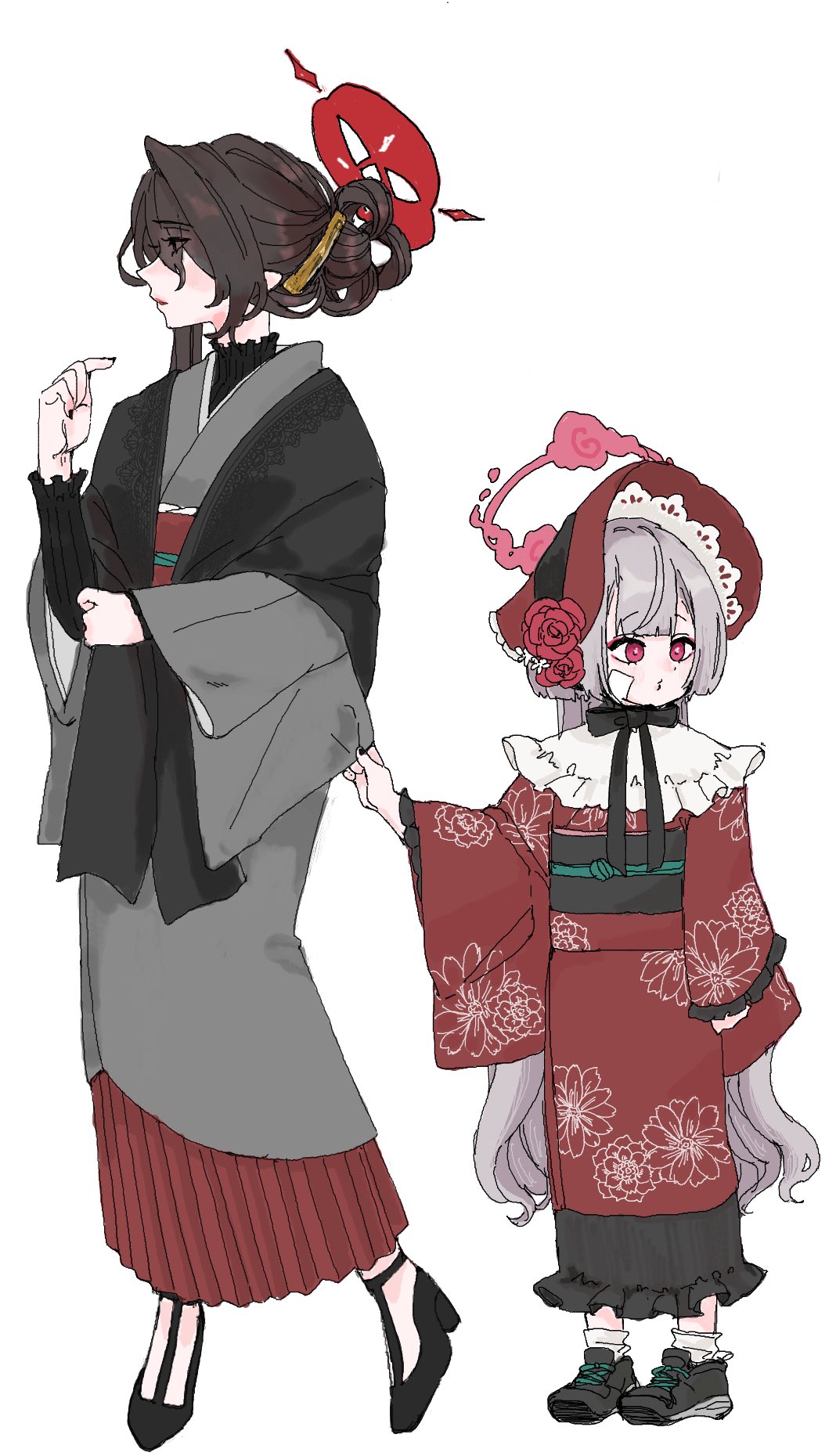 2girls alternate_costume blue_archive closed_mouth floral_print full_body hair_ornament highres holding japanese_clothes kimono kokuriko_(blue_archive) long_hair multiple_girls nail_polish obi red_eyes sash shuro_(blue_archive) simple_background standing syurorori white_background wide_sleeves