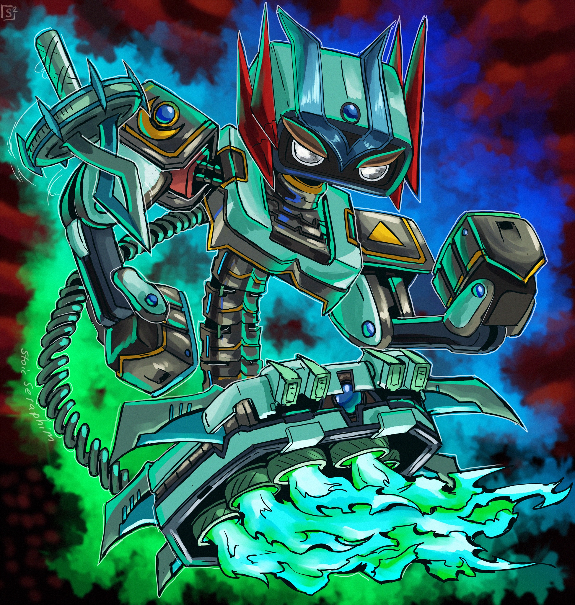alternate_color alternate_eye_color alternate_weapon angry armor aura blue_gem clenched_hands corruption crescent crossover dark_persona double_helix facial_tattoo family_computer_robot fierce_deity fire flying gem hal_laboratory highres looking_to_the_side nintendo no_pupils pauldrons possessed possession robot shoulder_armor spinning_top stoic_seraphim super_smash_bros. tattoo the_legend_of_zelda the_legend_of_zelda:_majora's_mask thrusters triangle weapon white_eyes