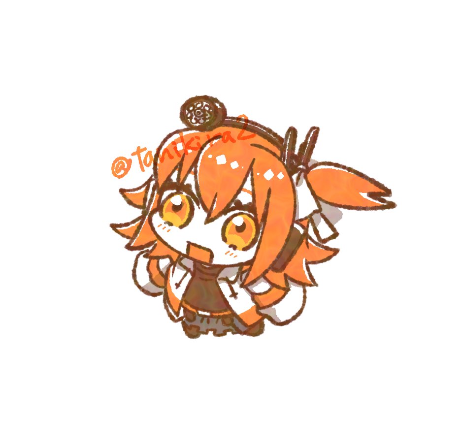 1girl a.i._voice adachi_rei belt belt_buckle black_shirt buckle chibi chibi_only colored_skin commentary from_above full_body grey_skirt hair_ribbon headlamp jacket long_sleeves looking_up one_side_up open_clothes open_jacket open_mouth orange_belt orange_eyes orange_hair radio_antenna ribbon shirt simple_background skirt solo standing tanikira twitter_username utau watermark white_background white_jacket white_ribbon white_skin