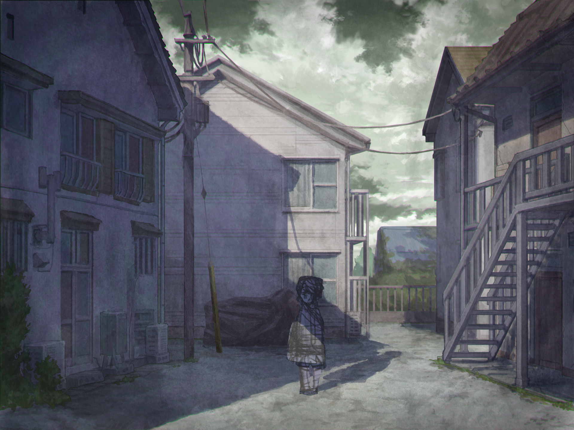 1boy building cloud cloudy_sky door highres house keishi109 original outdoors power_lines scenery shadow sky solo stairs town utility_pole