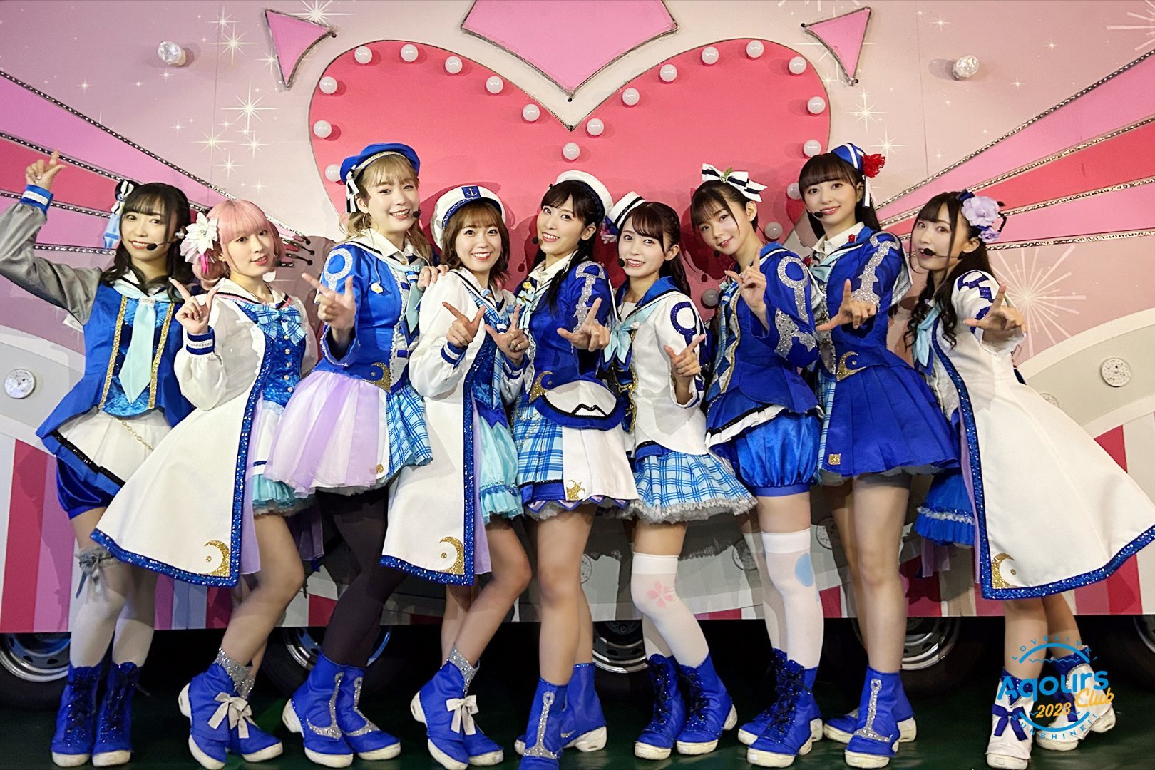 9girls aida_rikako costume dress furihata_ai highres inami_anju indoors kobayashi_aika komiya_arisa looking_at_viewer multiple_girls photo_(medium) real_life saito_shuka smile standing suwa_nanaka suzuki_aina_(voice_actor) takatsuki_kanako voice_actor watermark