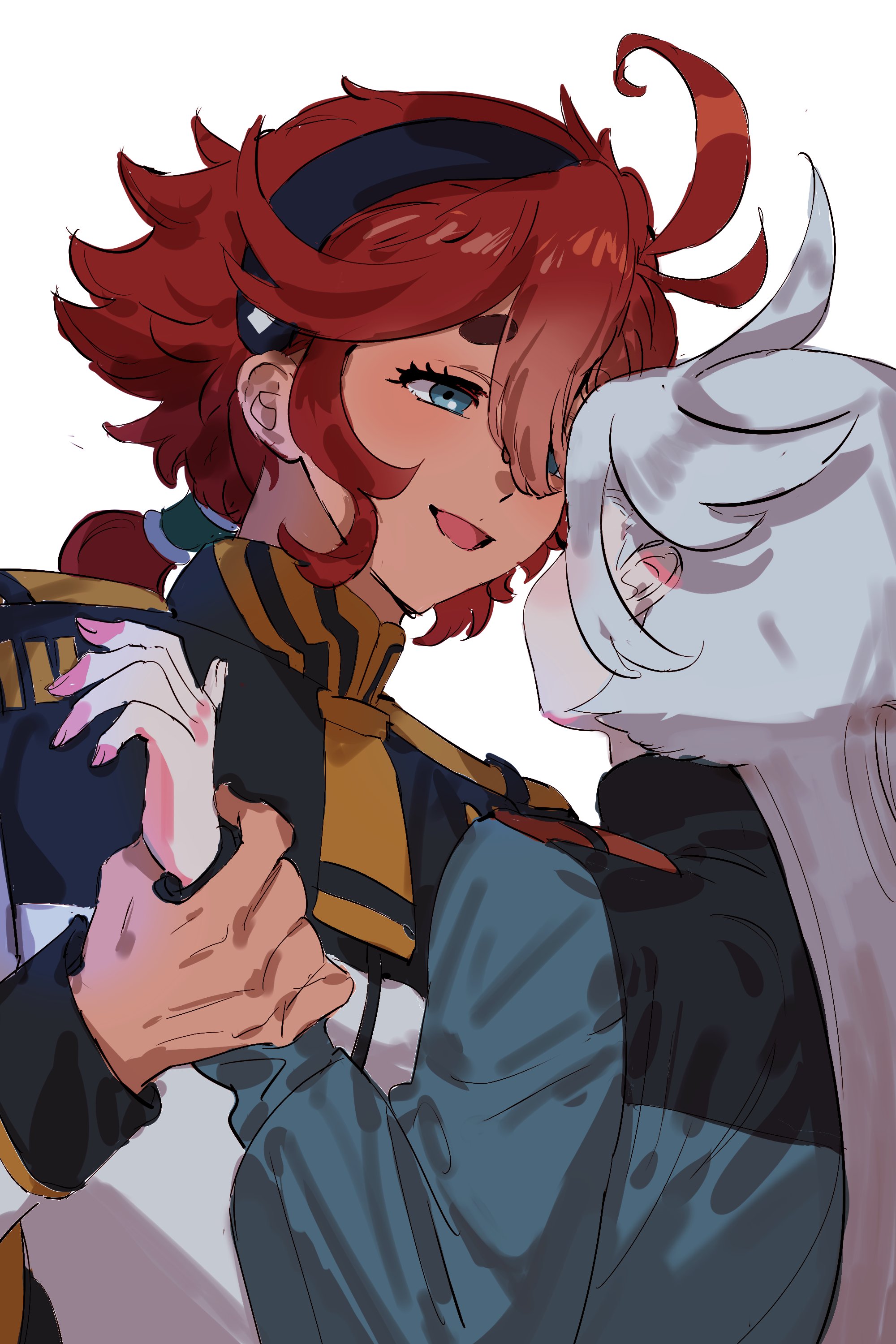 2girls absurdres ahoge asticassia_school_uniform belletaku black_hairband blue_eyes commentary_request green_jacket gundam gundam_suisei_no_majo hairband highres holding_another's_wrist jacket korean_commentary long_hair looking_at_another miorine_rembran multiple_girls necktie open_mouth red_hair school_uniform simple_background smile suletta_mercury thick_eyebrows upper_body white_background white_hair white_jacket yellow_necktie yuri