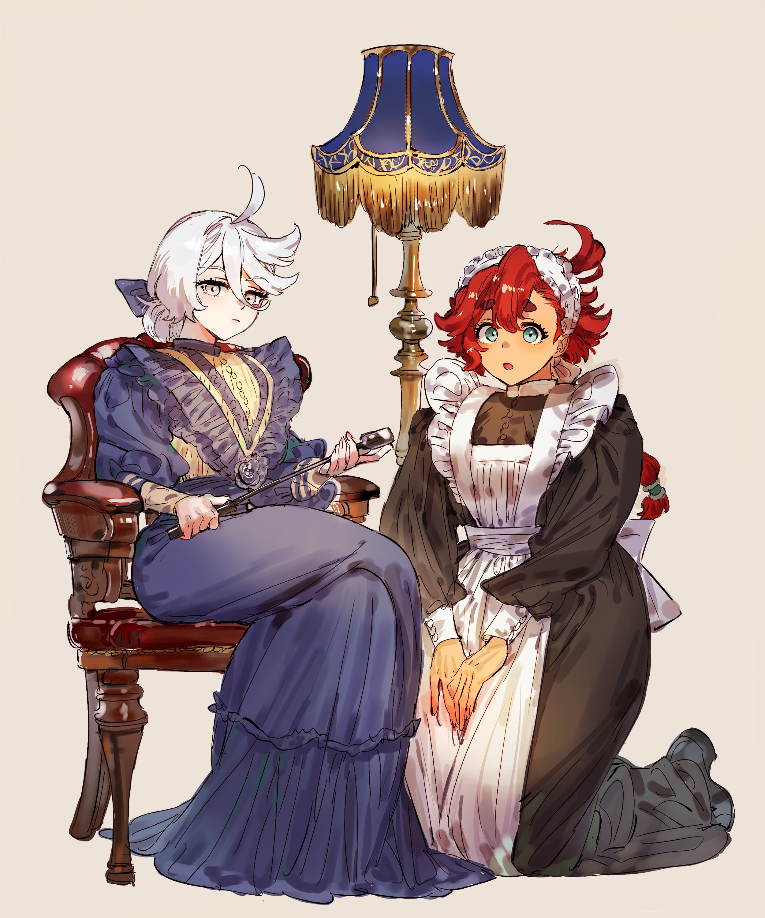 2girls absurdres alternate_costume apron armchair belletaku black_dress blue_dress blue_eyes brown_background chair dark-skinned_female dark_skin dress enmaided female_focus full_body grey_eyes gundam gundam_suisei_no_majo highres holding holding_riding_crop kneeling lamp long_dress long_hair long_sleeves looking_at_viewer maid maid_apron maid_headdress miorine_rembran multiple_girls open_mouth red_hair riding_crop simple_background sitting suletta_mercury thick_eyebrows white_apron white_hair white_headdress