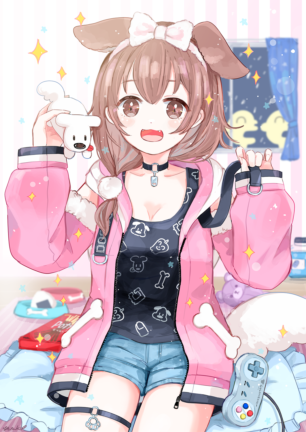 1girl :d animal animal_ears animal_print black_choker black_shirt blue_shorts bone_print bow bow_hairband breasts brown_eyes brown_hair choker cleavage collarbone controller curtains cushion deformed denim denim_shorts detached_sleeves dog dog_ears dog_girl dog_print double-parted_bangs fang food fur-trimmed_sleeves fur_trim game_controller hair_ornament hairband highres holding holding_animal hololive hood hoodie hoso-inu indoors inugami_korone inugami_korone_(roomwear) jar light_blush light_particles long_hair low_ponytail o-ring o-ring_choker o-ring_thigh_strap onigiri open_clothes open_hoodie open_mouth pendant_choker pink_hoodie pocky pom_pom_(clothes) pom_pom_hair_ornament ponytail print_shirt raised_eyebrows red_carpet shirt short_shorts shorts sidelocks sitting small_breasts smile solo sparkle stuffed_animal stuffed_toy tareme teddy_bear thigh_strap tongue tongue_out virtual_youtuber white_bow white_hairband window wooden_floor yutukicom