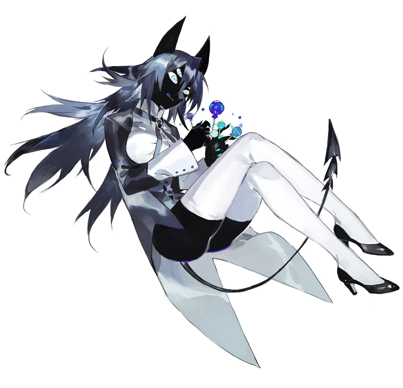 1girl between_fingers black_footwear black_gem black_hair black_horns black_jacket black_ribbon black_shorts black_skin black_sleeves black_thighhighs breasts brooch buttons candy character_request chinese_commentary chupa_chups claws collared_shirt colored_skin commentary_request copyright_request crossed_legs demon_horns demon_tail extra_ears food full_body gem green_eyes hair_between_eyes high_collar high_heels holding holding_candy holding_food holding_lollipop horns jacket jewelry large_breasts lollipop long_hair long_sleeves monster_girl neck_ribbon pantyhose partially_unbuttoned ribbon shirt shorts simple_background sitting solo starshadowmagician tail thighhighs white_background white_pantyhose white_shirt