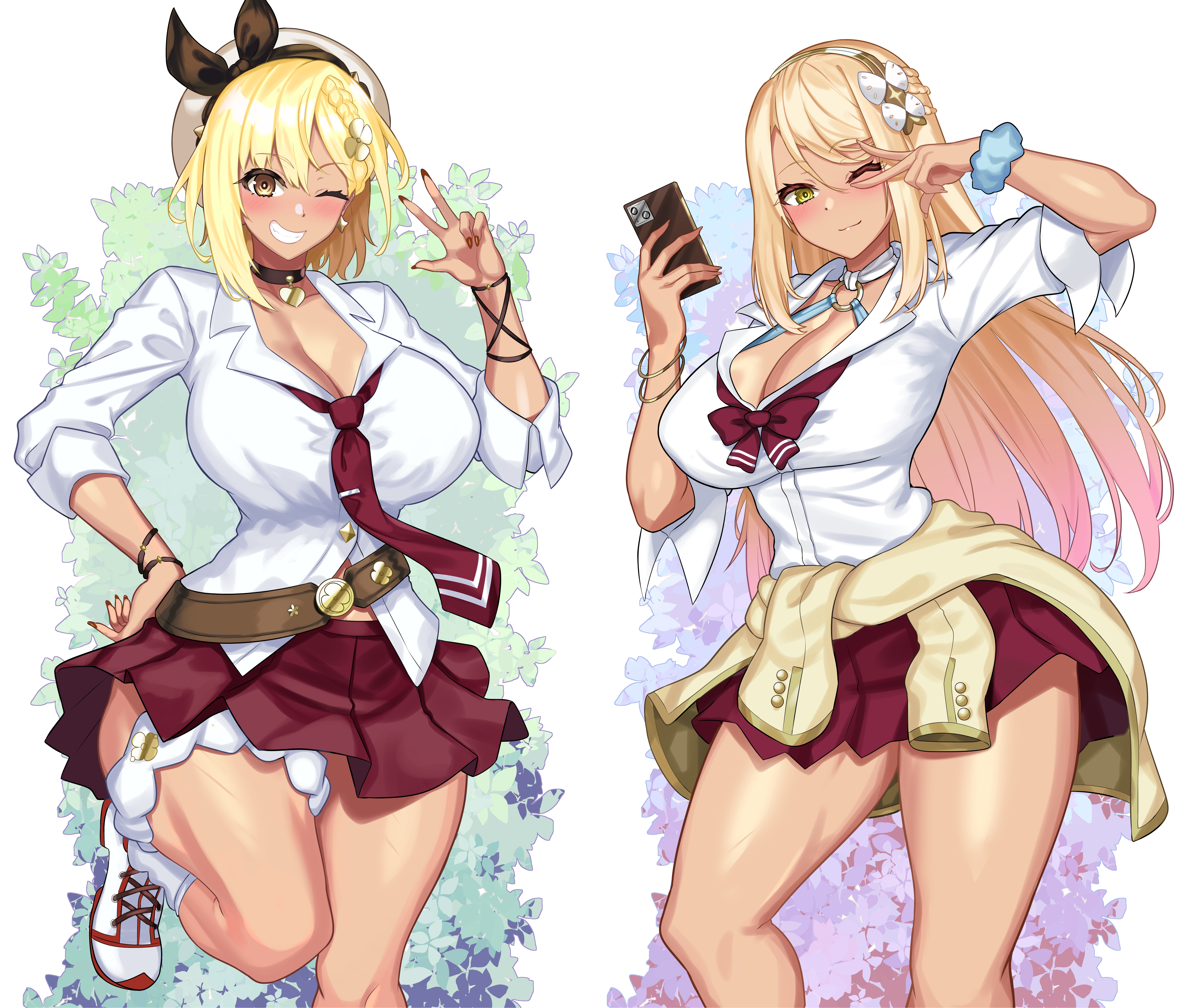 2girls absurdres atelier_(series) atelier_resleriana atelier_ryza atelier_ryza_1 beret blonde_hair blush breasts cleavage collar earrings gyaru hair_ornament hat highres holding holding_phone jewelry klaudia_valentz large_breasts long_hair looking_at_viewer multiple_girls nez-box phone reisalin_stout reisalin_stout_(blooming_energy) short_hair smile v