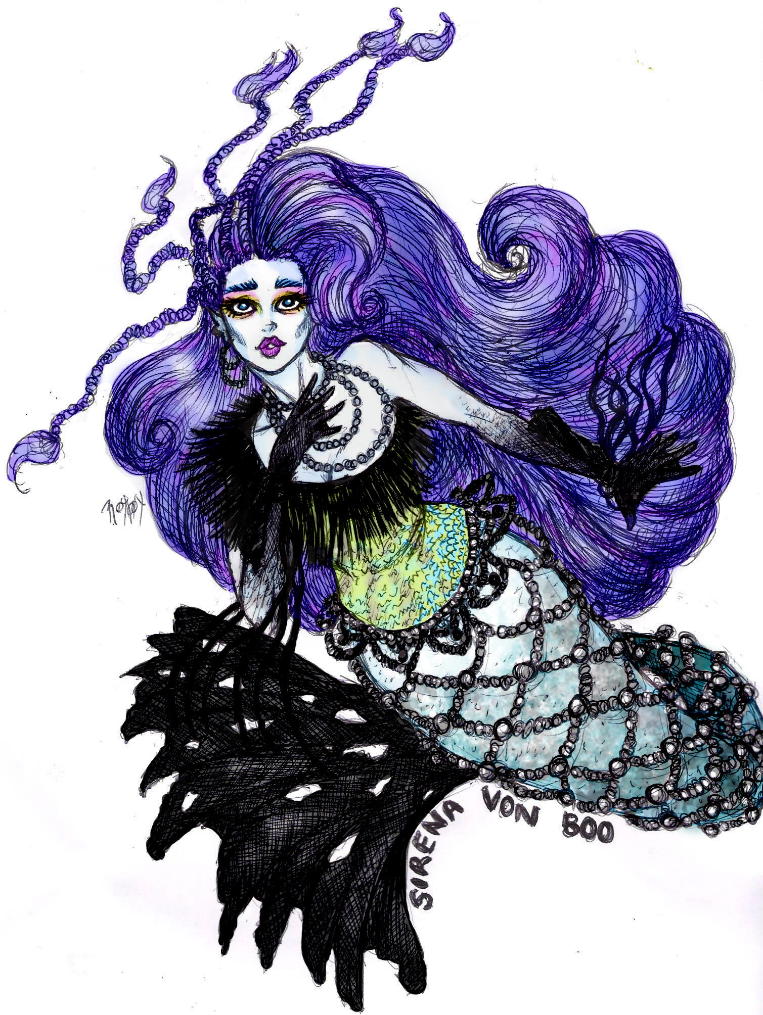 1girl braid floating_hair highres jewelry long_hair looking_at_viewer mermaid monster_girl monster_high monster_high_(g1) necklace pale_skin purple_hair purple_lips sirena_von_boo solo tsuyu89 very_long_hair