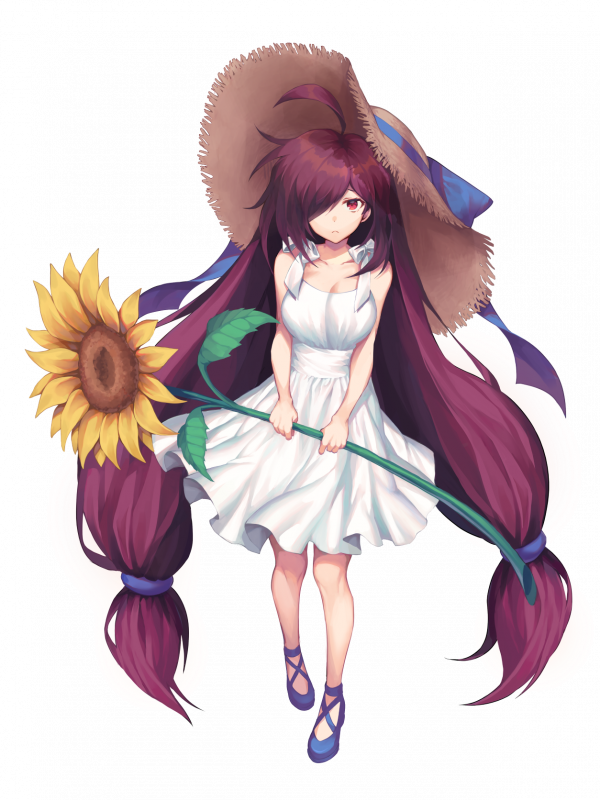 1girl absurdly_long_hair ahoge blue_footwear blue_ribbon collarbone cross-laced_footwear dress expressionless final_gear flower hair_over_one_eye hat hat_ribbon holding holding_flower long_hair looking_at_viewer low-tied_long_hair low_ponytail official_art pn99_(final_gear) ponytail purple_hair red_eyes ribbon simple_background sleeveless solo standing sun_hat sundress sunflower tachi-e third-party_source tied_dress transparent_background very_long_hair white_dress yellow_flower