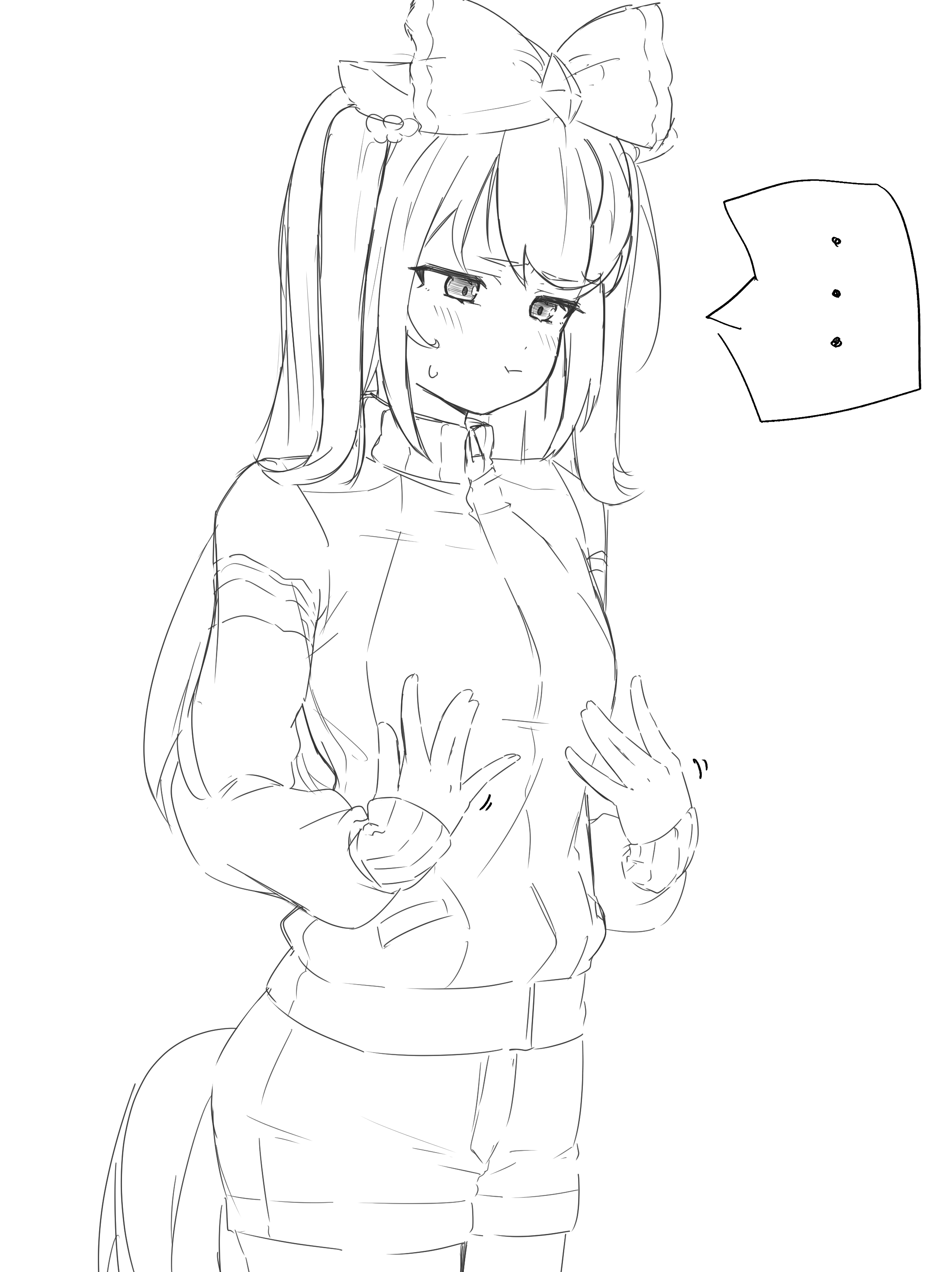 ... 1girl absurdres agnes_digital_(umamusume) alternate_costume animal_ears annoyed blush breast_conscious breasts commentary_request hair_between_eyes hair_ornament highres horse_ears horse_girl jacket long_hair monochrome pout shorts simple_background small_breasts solo takapachi.jp track_jacket umamusume