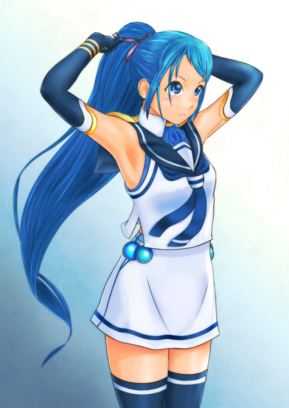 1girl ahoge armpits arms_up blue_eyes blue_hair blue_neckerchief commentary_request elbow_gloves gloves highres kantai_collection long_hair looking_to_the_side neckerchief ponytail sailor_collar samidare_(kancolle) shirt skirt solo thighhighs tying_hair uzuki_mei very_long_hair white_shirt white_skirt zettai_ryouiki