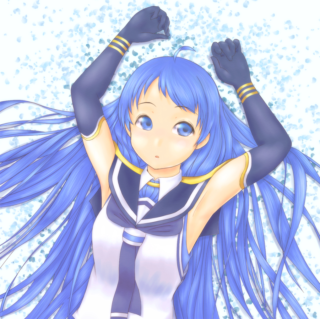 1girl ahoge arms_up blue_eyes blue_hair blue_neckerchief commentary_request elbow_gloves expressionless gloves hair_spread_out kantai_collection long_hair looking_at_viewer lying neckerchief on_back parted_lips sailor_collar samidare_(kancolle) shirt solo upper_body uzuki_mei white_shirt