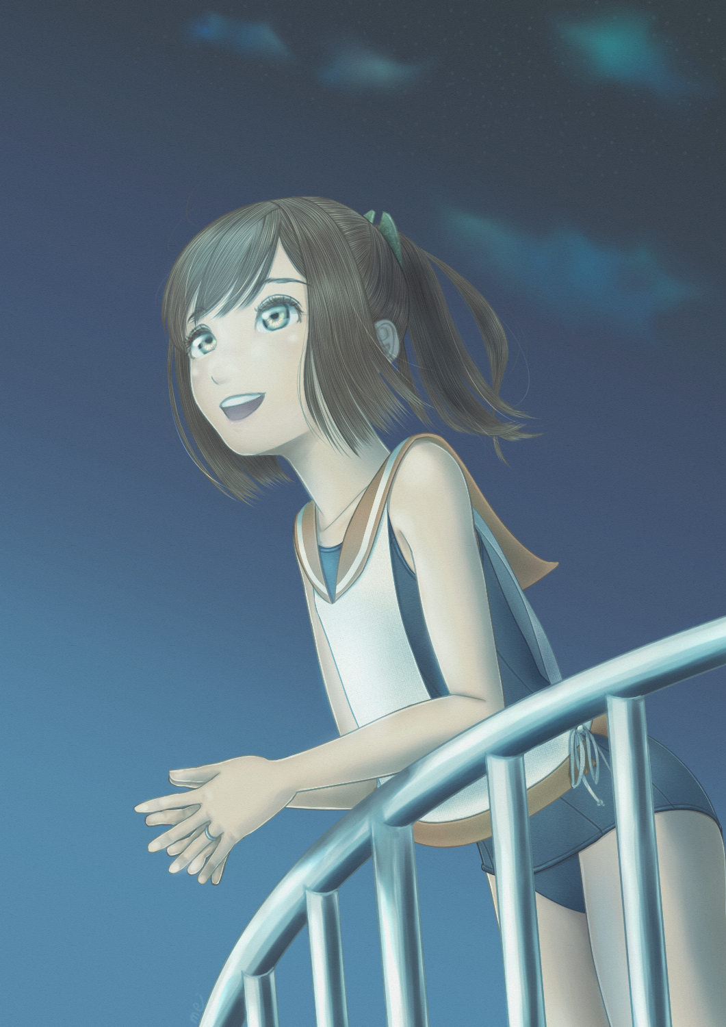 1girl blue_one-piece_swimsuit brown_eyes brown_hair commentary_request highres i-401_(kancolle) jewelry kantai_collection looking_afar night one-piece_swimsuit open_mouth orange_sailor_collar outdoors ponytail railing ring sailor_collar school_swimsuit short_hair short_ponytail side-tie_shirt sky smile solo swimsuit swimsuit_under_clothes uzuki_mei