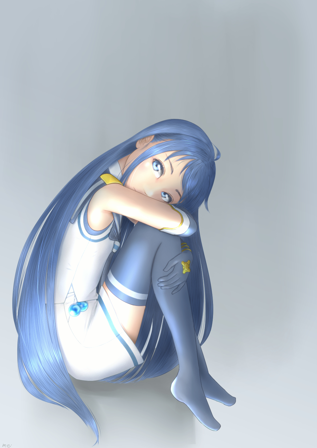 1girl ahoge bare_shoulders blue_eyes blue_hair commentary_request elbow_gloves full_body gloves highres hugging_own_legs kantai_collection knees_to_chest long_hair looking_at_viewer sailor_collar samidare_(kancolle) shirt skirt solo thighhighs uzuki_mei very_long_hair white_shirt white_skirt