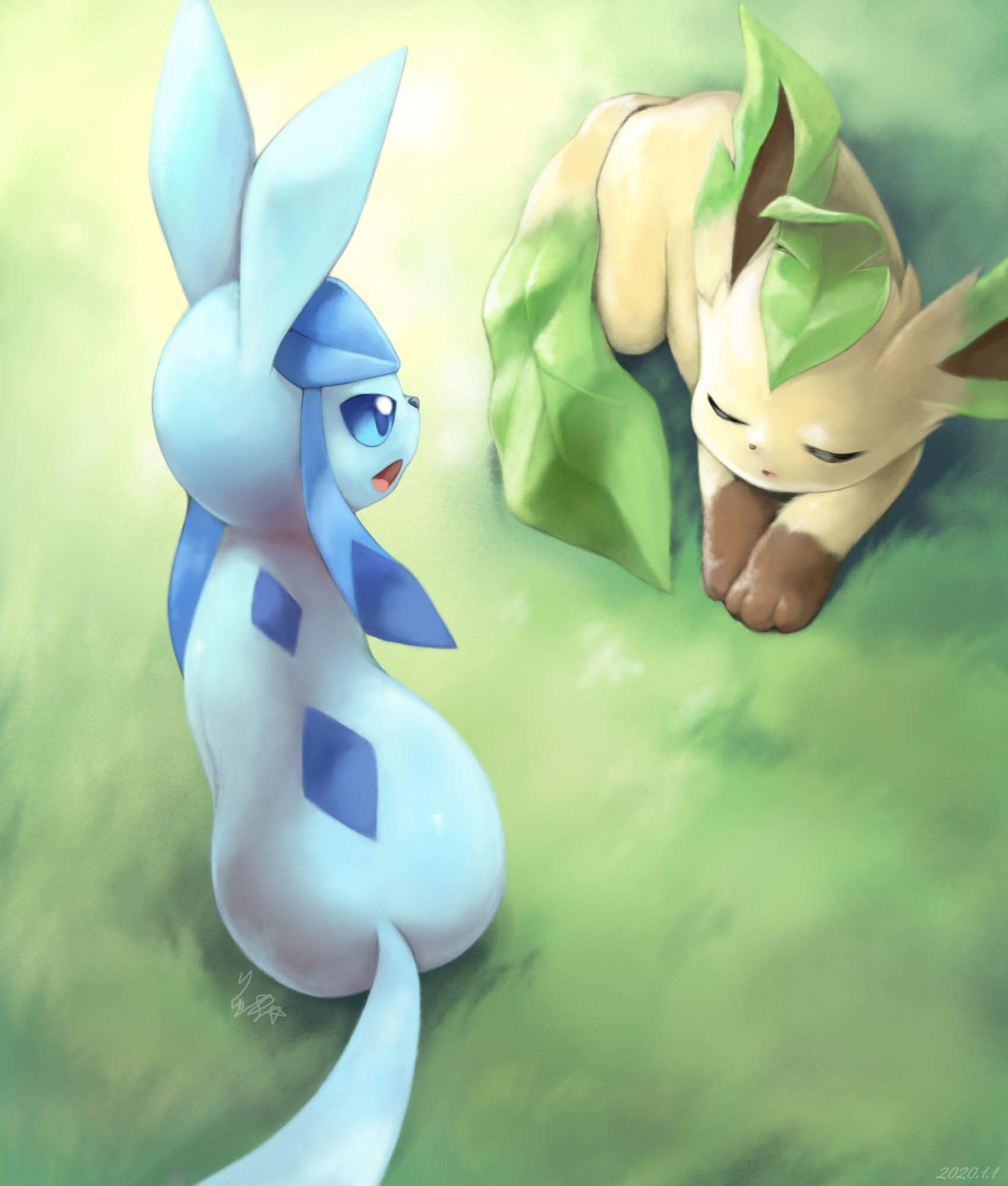 animal_focus blue_eyes blue_hair closed_eyes gen_4_pokemon glaceon grass highres leafeon lying nintendo no_humans open_mouth pokemon pokemon_(creature) ryuma210 signature sitting sleeping smile