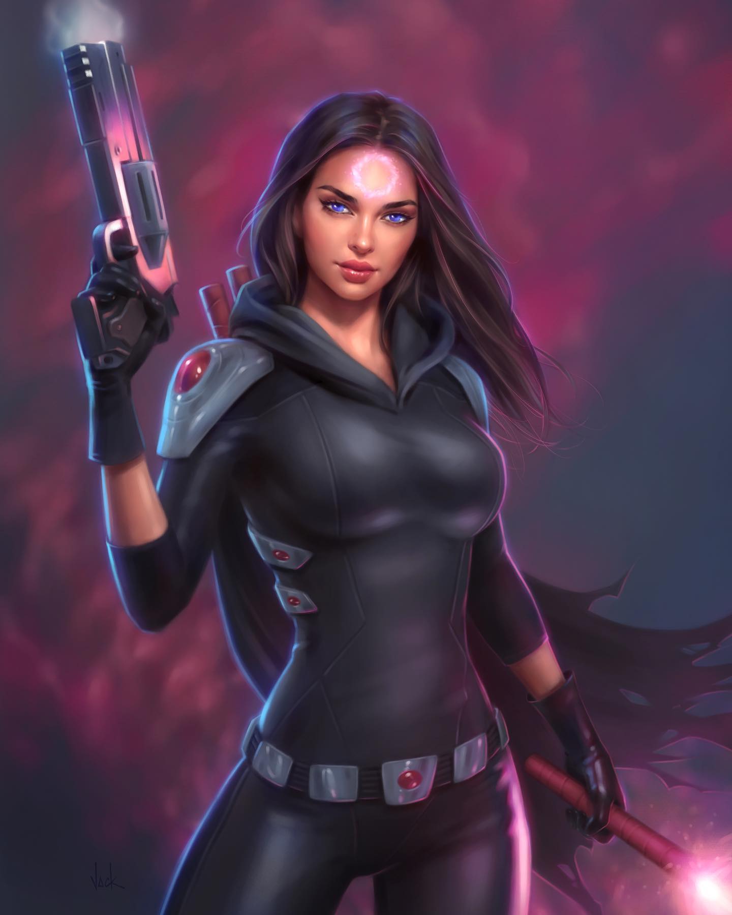 1girl black_bodysuit black_cape black_gloves black_hood blue_eyes bodysuit breasts brown_hair cape commentary contrapposto cowboy_shot english_commentary facial_mark flare forehead_mark gloves gun highres holding holding_fla holding_gun holding_weapon large_breasts nocterra red_lips shoulder_pads solo valentina_riggs weapon will_jack