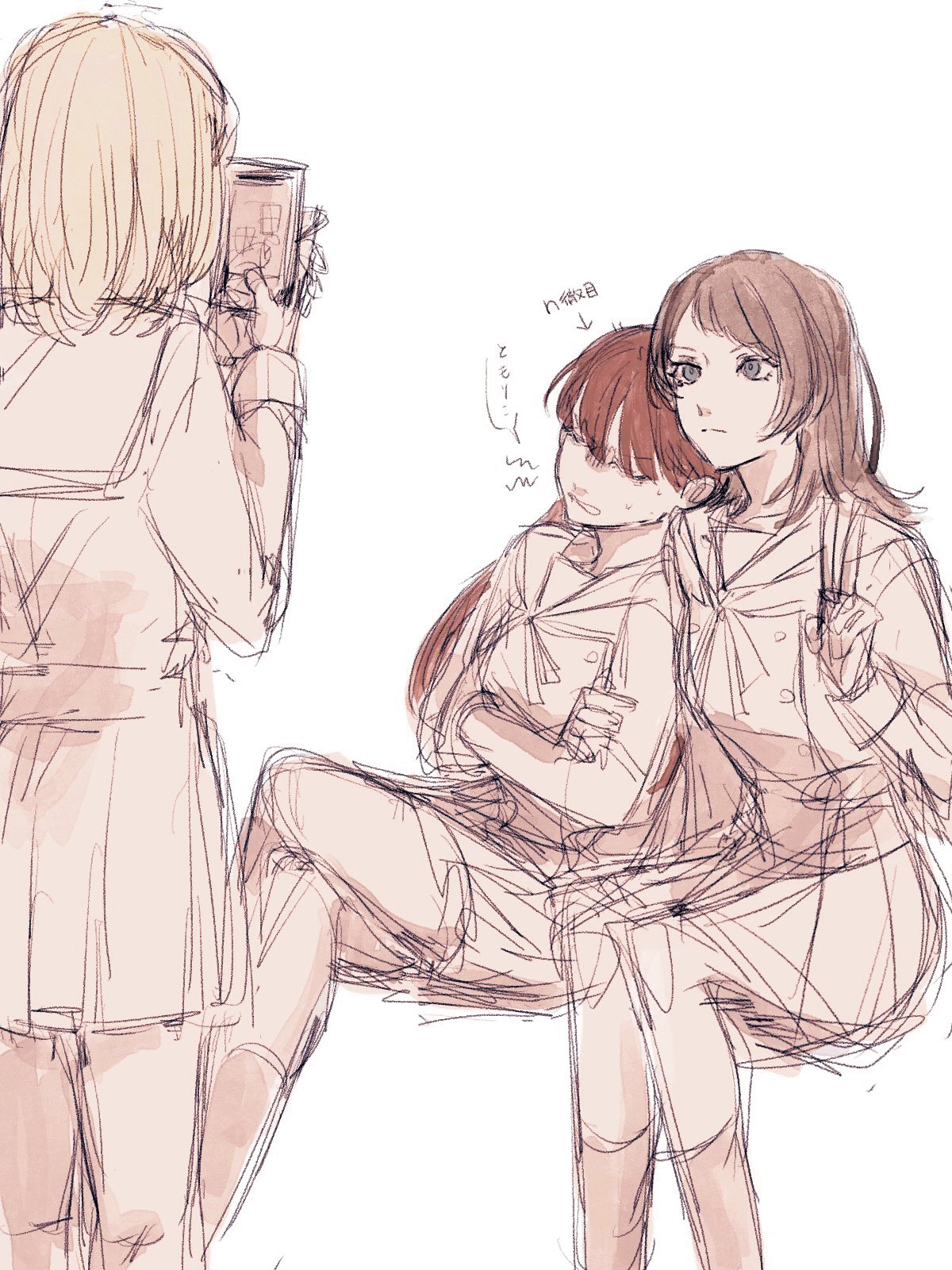 3girls bang_dream! bang_dream!_it's_mygo!!!!! blonde_hair brown_hair closed_eyes closed_mouth dress expressionless grey_eyes hanasakigawa_school_uniform highres holding holding_phone long_hair medium_hair misumi_uika moyo_(moyo_4) multiple_girls phone sailor_dress school_uniform shiina_taki simple_background sitting standing sweatdrop taking_picture translation_request v white_background yahata_umiri