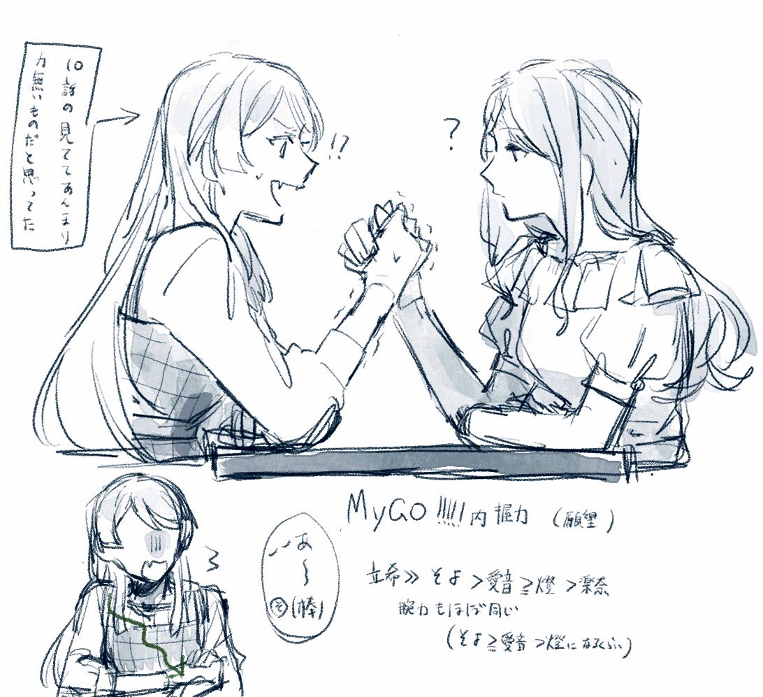 !? 2girls ? arm_wrestling bang_dream! bang_dream!_it's_mygo!!!!! chihaya_anon dress fang greyscale long_hair long_sleeves monochrome moyo_(moyo_4) multiple_girls nagasaki_soyo open_mouth pinafore_dress shirt short_sleeves skin_fang sleeveless sleeveless_dress speech_bubble translation_request