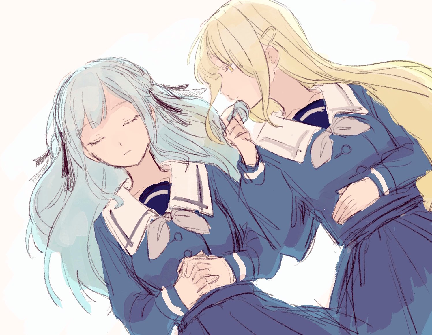 2girls bang_dream! bang_dream!_it's_mygo!!!!! black_ribbon blonde_hair blue_hair blue_shirt blue_skirt closed_eyes closed_mouth grey_neckerchief hair_ornament hair_ribbon hairclip hand_in_another's_hair kissing_hair long_hair lying moyo_(moyo_4) multiple_girls neckerchief on_back pleated_skirt ribbon sailor_collar school_uniform shirt simple_background skirt sleeping togawa_sakiko tsukinomori_school_uniform two_side_up wakaba_mutsumi white_background white_sailor_collar yellow_eyes yuri