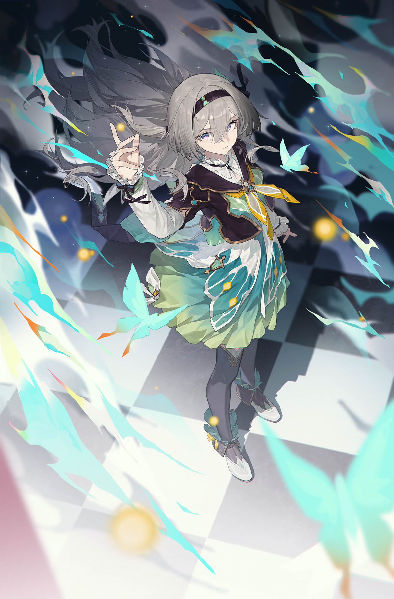1girl aqua_skirt arm_up black_hairband black_jacket black_thighhighs checkered_floor closed_mouth cropped_jacket fire firefly_(honkai:_star_rail) floating_hair from_above full_body grey_hair hair_between_eyes hair_intakes hairband hand_up highres honkai:_star_rail honkai_(series) jacket lettereast looking_at_viewer looking_up multicolored_eyes neckerchief orange_neckerchief shadow shirt skirt solo thighhighs two-tone_eyes white_footwear white_shirt yellow_neckerchief