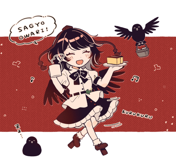 1girl animal beamed_sixteenth_notes bird bird_wings black_hair black_skirt black_wings blush closed_eyes collared_shirt crow cup eighth_note feathered_wings food frilled_skirt frills full_body geta hat holding holding_cup holding_plate mozukuzu_(manukedori) musical_note open_mouth plate puffy_short_sleeves puffy_sleeves red_footwear red_hat shameimaru_aya shirt short_hair short_sleeves skirt smile socks solo tengu-geta tokin_hat touhou wagashi white_shirt white_socks wings youkan_(food)