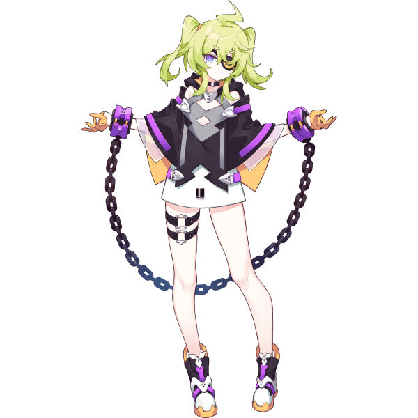 >:) 1girl ahoge aqua_eyes artist_request barcode bare_legs bare_shoulders black_capelet black_choker capelet chain chained_wrists choker cleavage_cutout closed_mouth clothing_cutout dress eyepatch final_gear gloves green_hair hair_tie knees multicolored_capelet o-ring o-ring_choker o-ring_thigh_strap official_art one_eye_covered orange_gloves parted_lips see-through_clothes shoes short_hair sidelocks simple_background smile sneakers solo standing tachi-e thea_(final_gear) thigh_strap third-party_source transparent_background twintails v-shaped_eyebrows white_dress wrist_cuffs