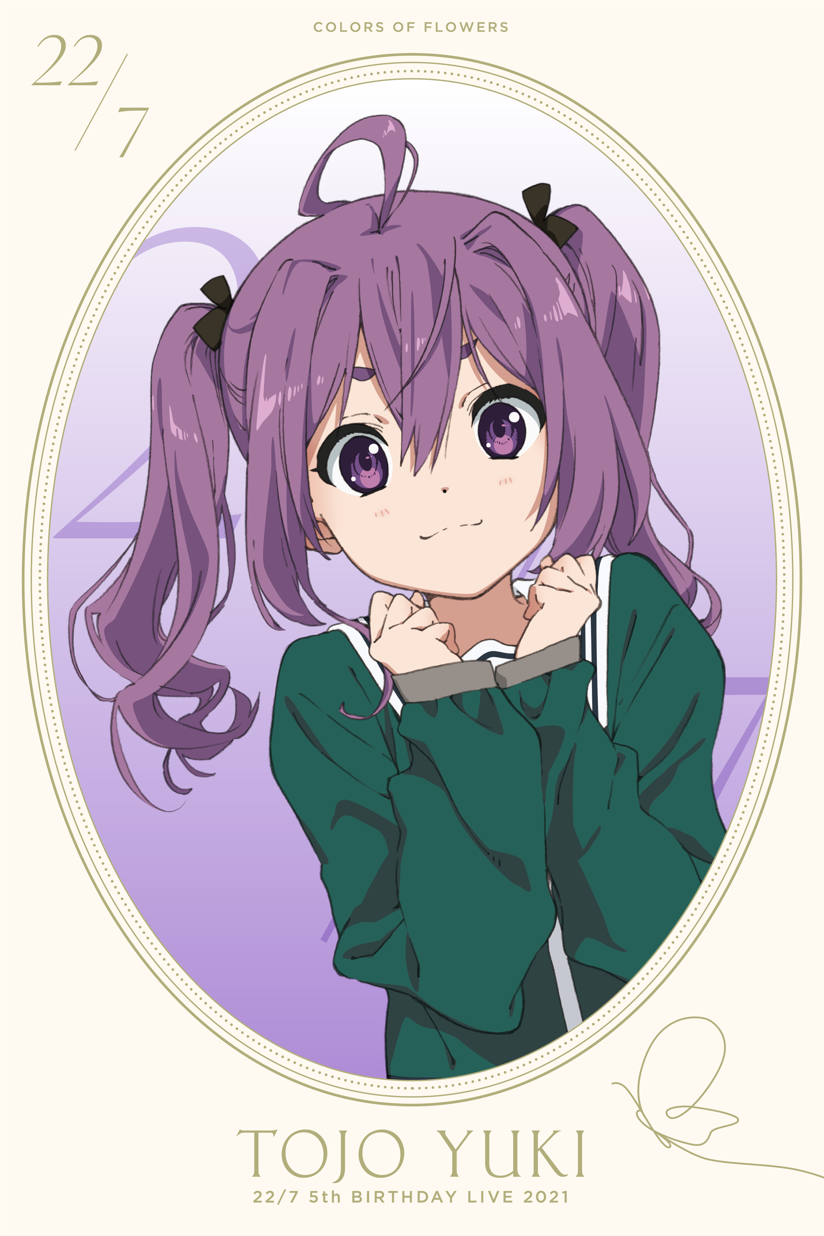1girl 22/7 absurdres ahoge black_bow black_bowtie border bow bowtie character_name dated green_shirt hair_bow hair_ornament highres horiguchi_yukiko long_sleeves looking_at_viewer non-web_source official_art oval_border purple_eyes purple_hair rokubanchou_school_uniform round_border sailor_collar school_uniform serafuku shirt smile solo tojo_yuki twintails upper_body white_sailor_collar winter_uniform