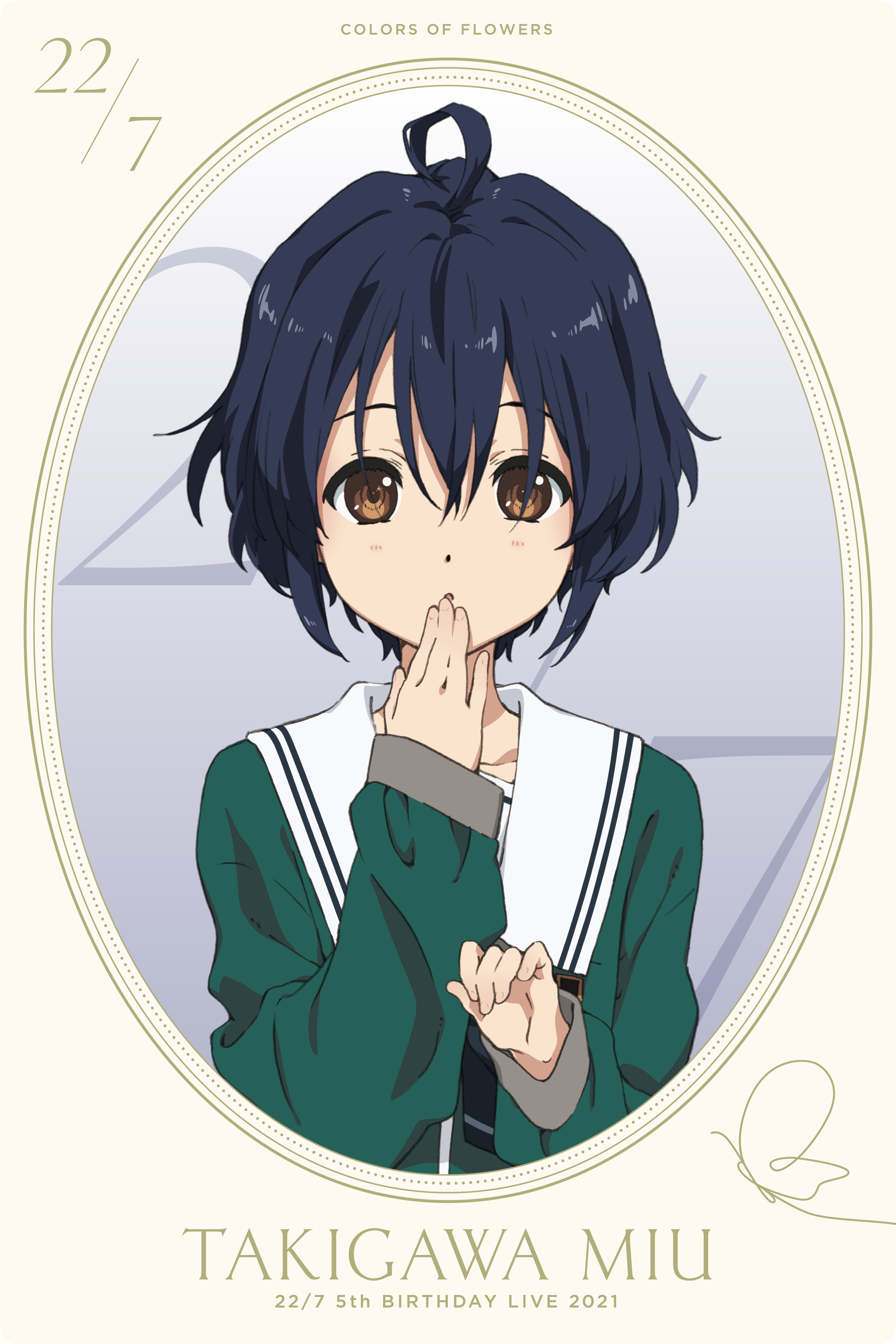 1girl 22/7 absurdres black_bow black_bowtie black_hair border bow bowtie brown_eyes character_name covering_own_mouth dated green_shirt hair_between_eyes highres horiguchi_yukiko long_sleeves looking_at_viewer official_art oval_border rokubanchou_school_uniform round_border sailor_collar school_uniform serafuku shirt short_hair solo takigawa_miu upper_body white_sailor_collar winter_uniform