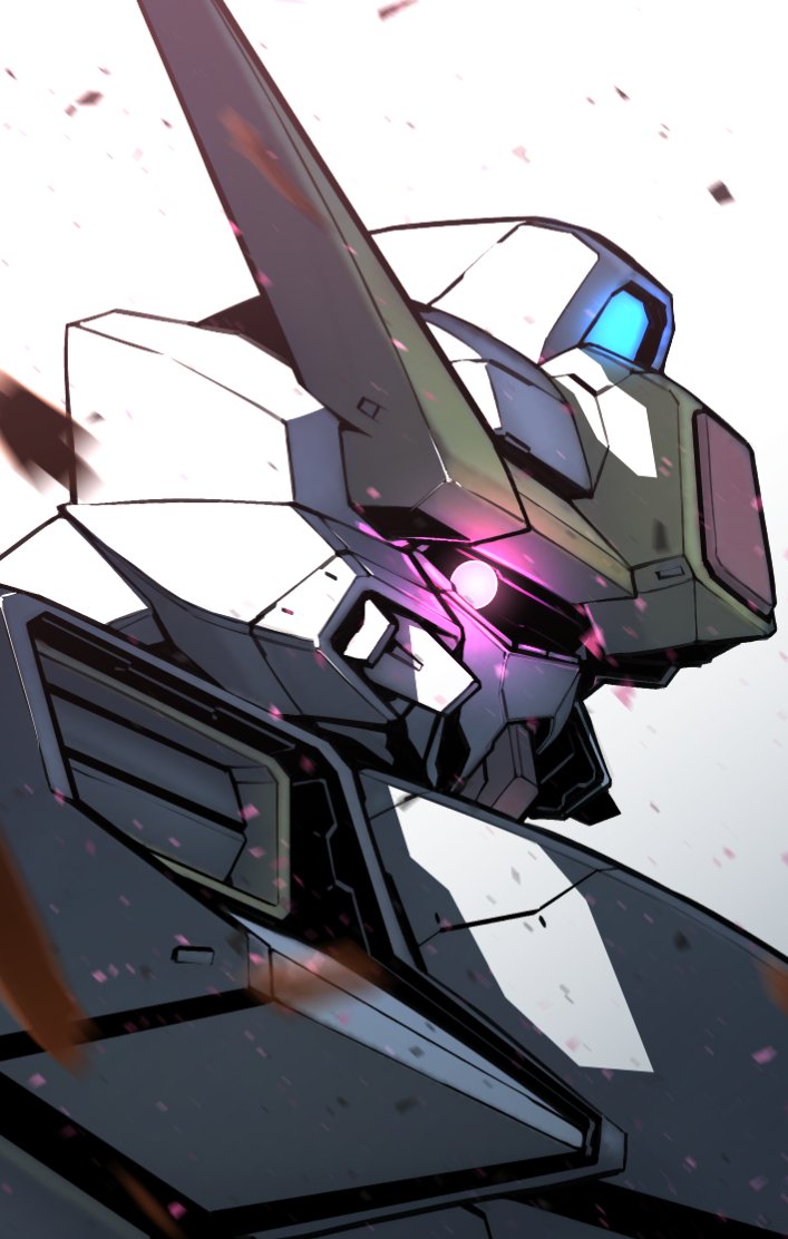 debris from_side glowing glowing_eye gundam kuri_giepi looking_at_viewer mecha mecha_focus mobile_suit motion_blur no_humans one-eyed portrait purple_eyes robot science_fiction sd_gundam sd_gundam_g_generation sd_gundam_g_generation:_monoeye_gundams sideways_glance simple_background sisquiede solo v-fin white_background