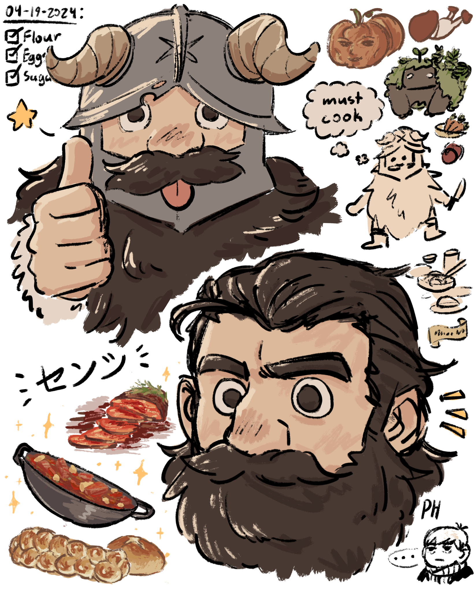 2boys :p beard beard_over_mouth chilchuck_tims cooking cropped_head dated doodle_inset dungeon_meshi dwarf english_text facial_hair fake_horns food golem helmet highres holding holding_knife horned_helmet horns knife long_beard looking_ahead looking_at_viewer male_focus motion_lines multiple_boys multiple_views mustache phongdraws pumpkin senshi_(dungeon_meshi) sparkle sparkling_aura speech_bubble star_(symbol) stew straight-on thick_mustache thought_bubble thumbs_up tongue tongue_out very_long_beard wok