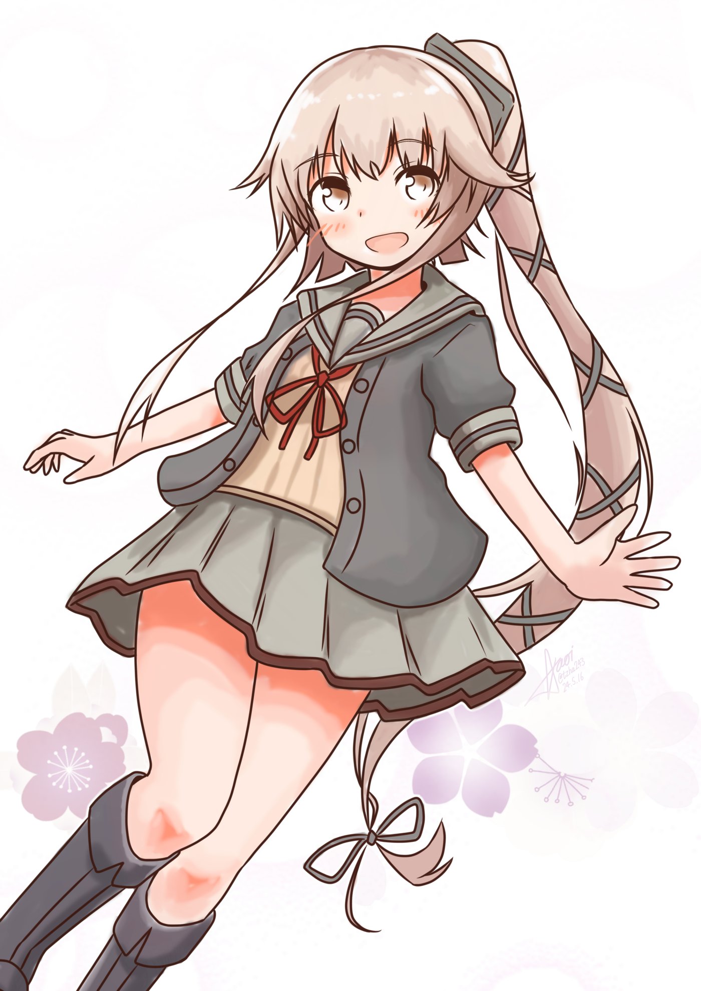 1girl aaoi black_footwear black_jacket feet_out_of_frame grey_sailor_collar grey_skirt hair_flaps highres jacket kantai_collection long_hair looking_at_viewer neck_ribbon one-hour_drawing_challenge pink_hair pleated_skirt ponytail red_ribbon ribbon sailor_collar school_uniform serafuku short_sleeves skirt smile solo very_long_hair yura_(kancolle) yura_kai_ni_(kancolle)