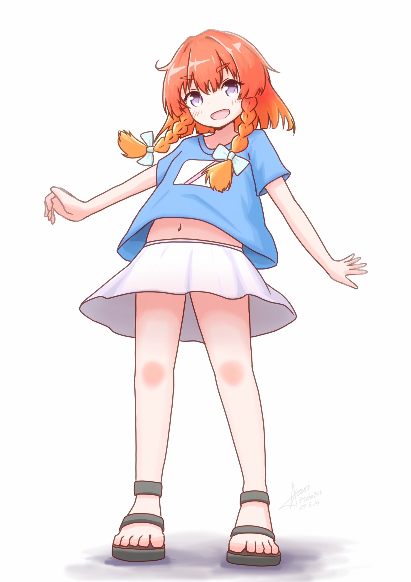 1girl aaoi alternate_costume blue_shirt bob_cut braid etorofu_(kancolle) full_body gradient_hair highres kantai_collection multicolored_hair one-hour_drawing_challenge orange_hair shirt short_hair_with_long_locks side_braid skirt smile solo standing t-shirt toeless_footwear twin_braids white_skirt