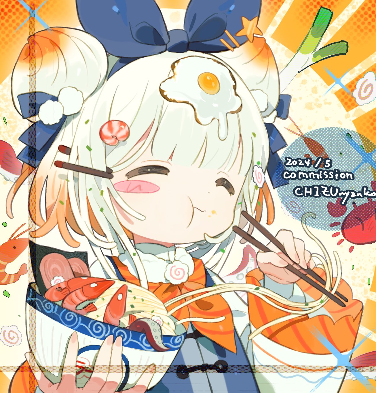1girl 2024 :t artist_name steamed_bun blue_bow blue_vest blunt_bangs blush_stickers bow bowl chizunyanko chopsticks closed_eyes closed_mouth collared_shirt commission crab dated double_bun eating egg_hair_ornament food food-themed_hair food-themed_hair_ornament food_on_face food_on_head fried_egg gradient_hair hair_bow hair_bun hair_ornament hairclip highres holding holding_bowl holding_chopsticks kamaboko long_sleeves multicolored_hair narutomaki narutomaki_hair_ornament neck_ribbon noodles nori_(seaweed) object_on_head orange_background orange_hair orange_ribbon original ramen ribbon seaweed shirt short_hair shrimp shrimp_hair_ornament single_blush_sticker solo spring_onion two-tone_hair upper_body vest white_hair white_shirt wide_sleeves